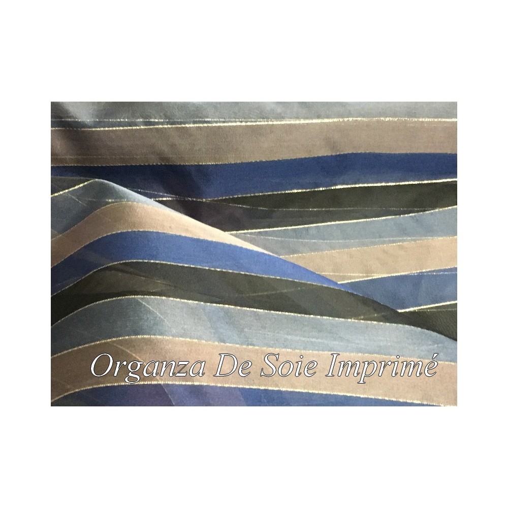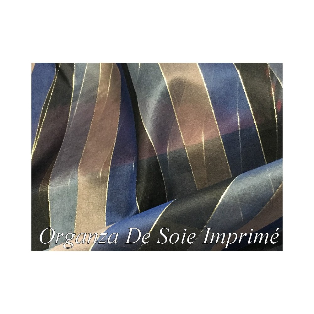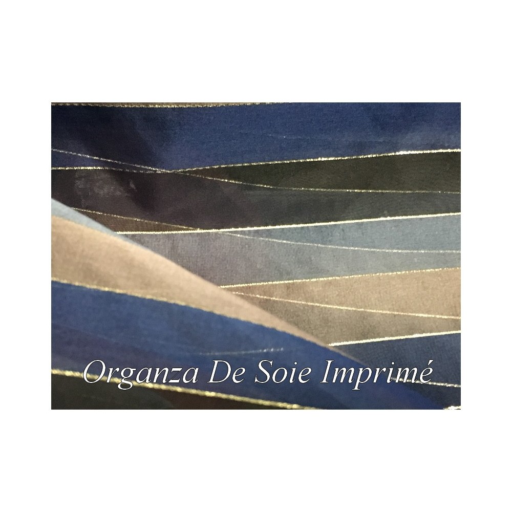 Découvrez notre sublime tissu organza de soie imprimé avec des rayures élégantes en noir, bleu indigo et prune clair, sublimées par des fines rayures dorées qui apporteront une touche de glamour à votre tenue.