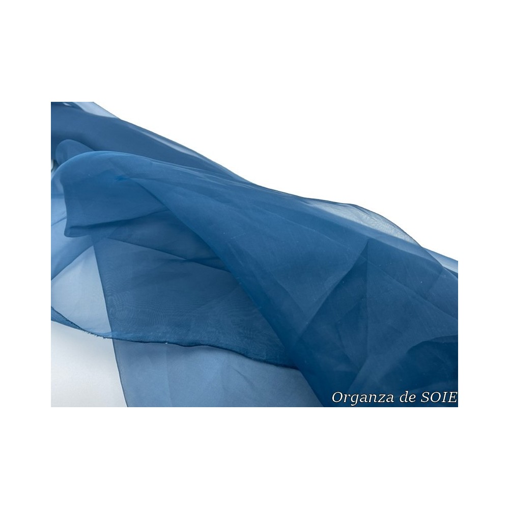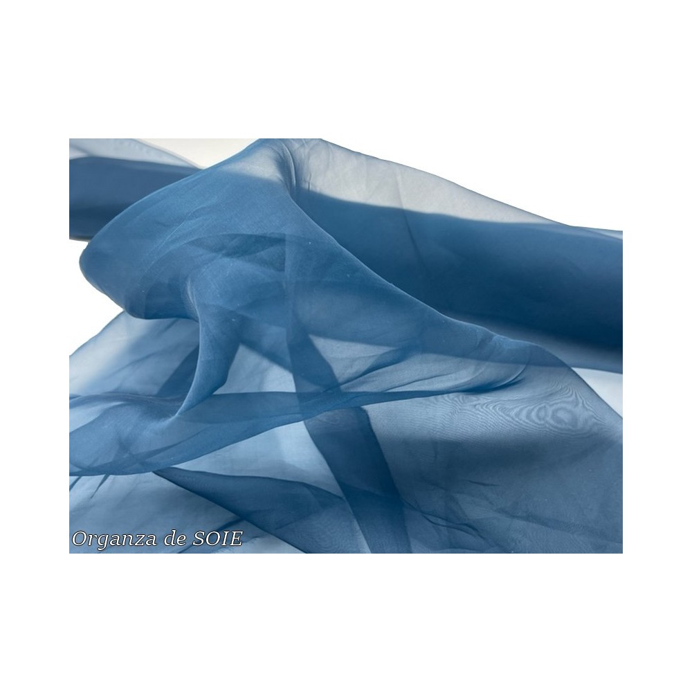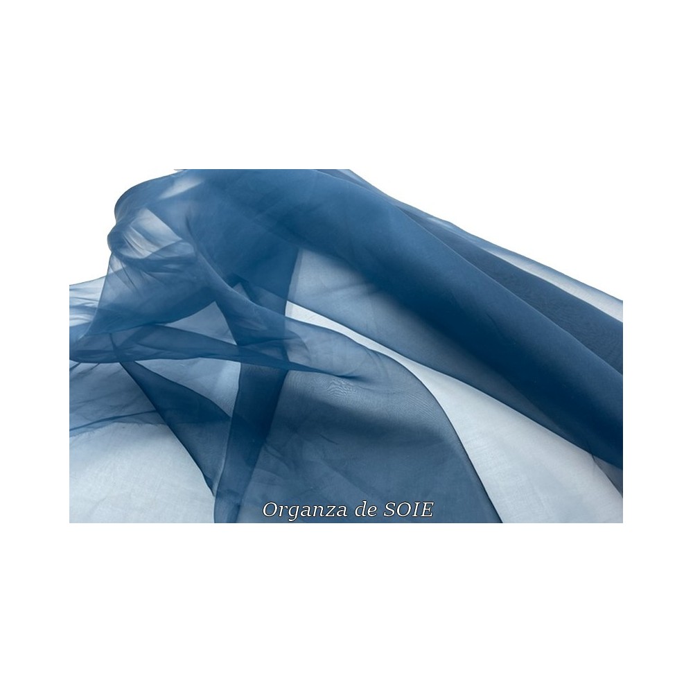 Notre tissu organza de soie est vendu au mètre avec une largeur de 1 mètre 50. Vous pouvez choisir parmi plusieurs couleurs, notamment ivoire, blanc, bleu marine et bleu indigo.