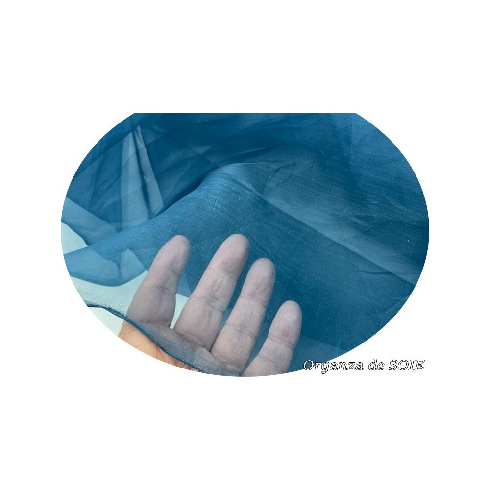 Sublimez vos créations avec notre tissu organza de soie en couleur bleu canard de fabrication française. Souple, soyeuse et fluide, cette soie de bonne qualité est idéale pour vos loisirs créatifs et customisations.