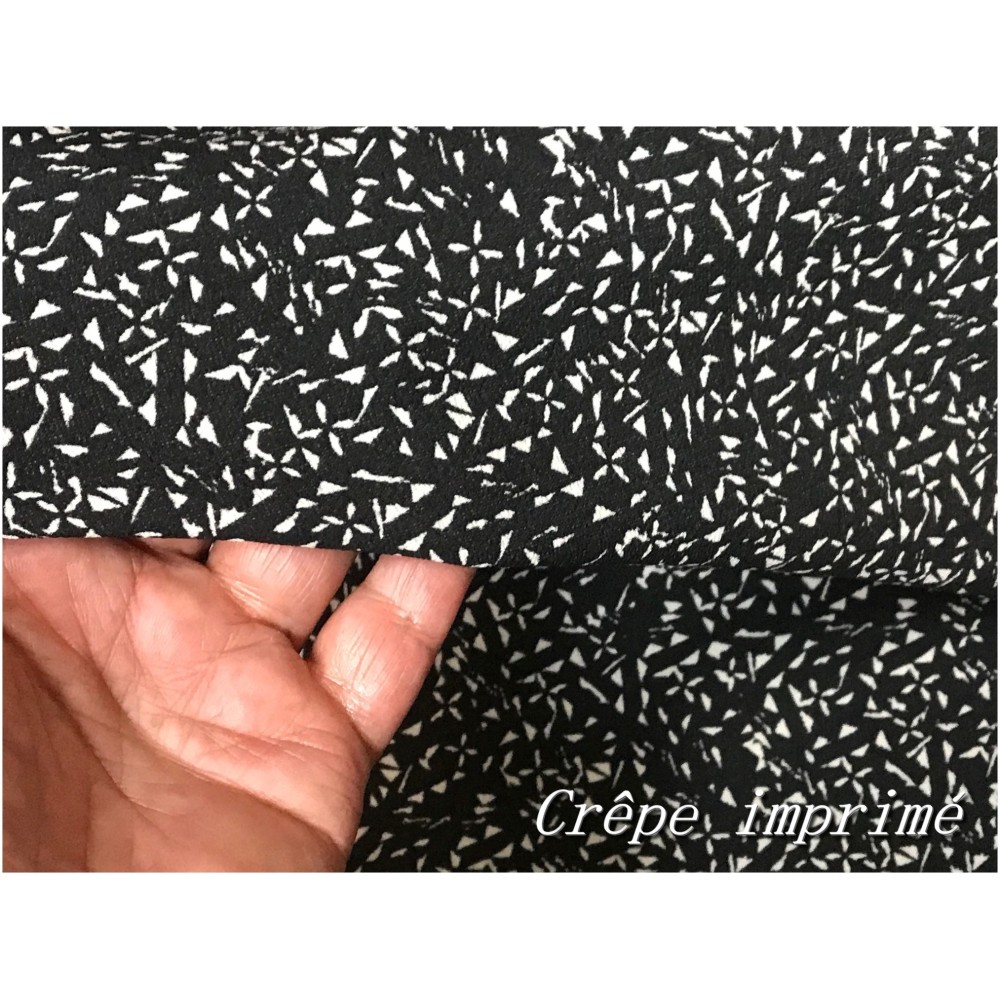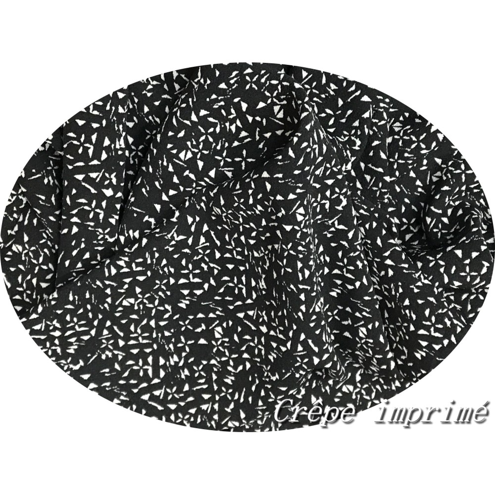 Le crêpe imprimé est apprécié pour sa texture légère et fluide, ainsi que pour son drapé élégant. Le motif écru sur fond noir ajoute une touche de sophistication et de contraste, créant un effet visuel captivant.