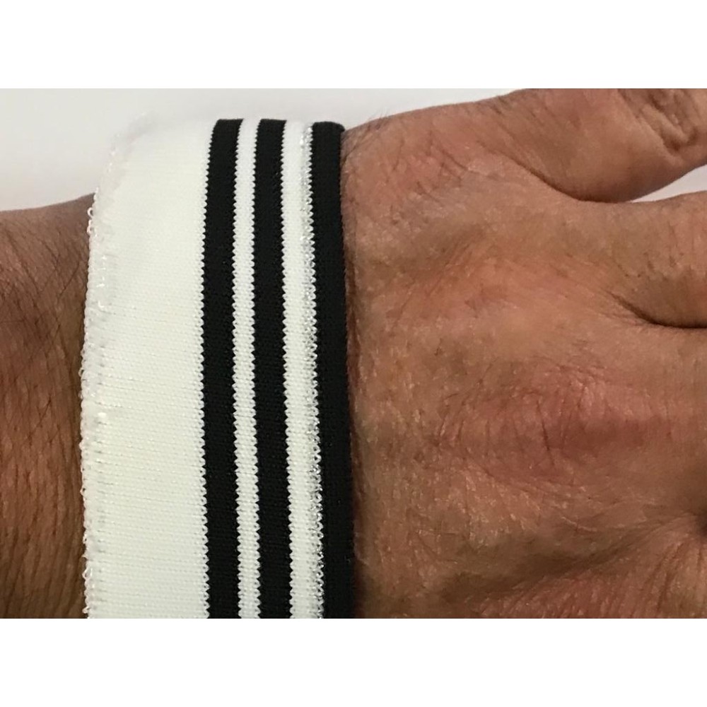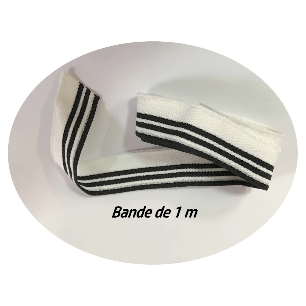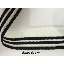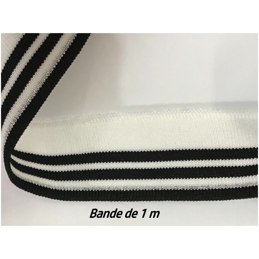 Découvrez notre bande de bord-côte blanc en tissu jersey, imprimée par 3 bandes argentées pour une touche d'éclat. Ce bord-côte élastique est parfait pour les poignées de manche et les bas de blousons.