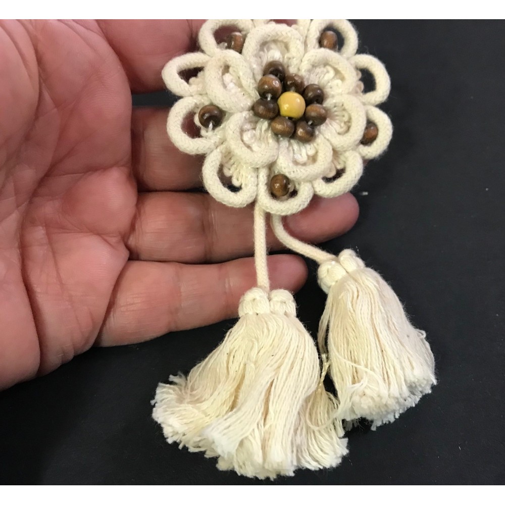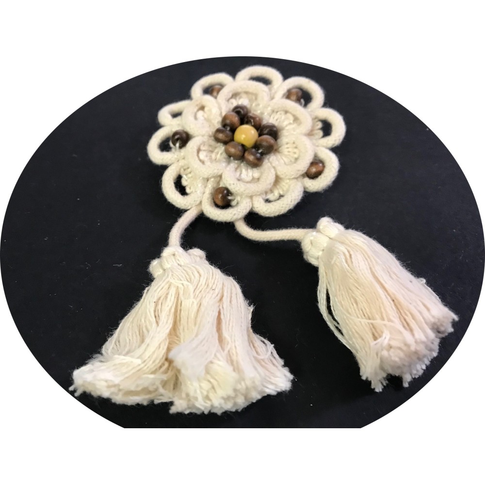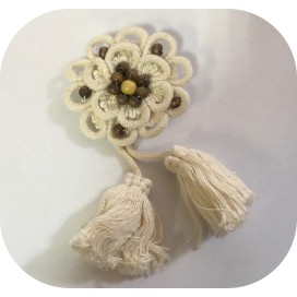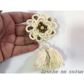 Nous vous présentons une magnifique broche en forme de fleur en coton écru avec des pompons en coton et des perles en bois. Cette broche est un véritable chef-d'œuvre artisanal, orné de perles en bois qui ajoutent une touche naturelle et élégante.