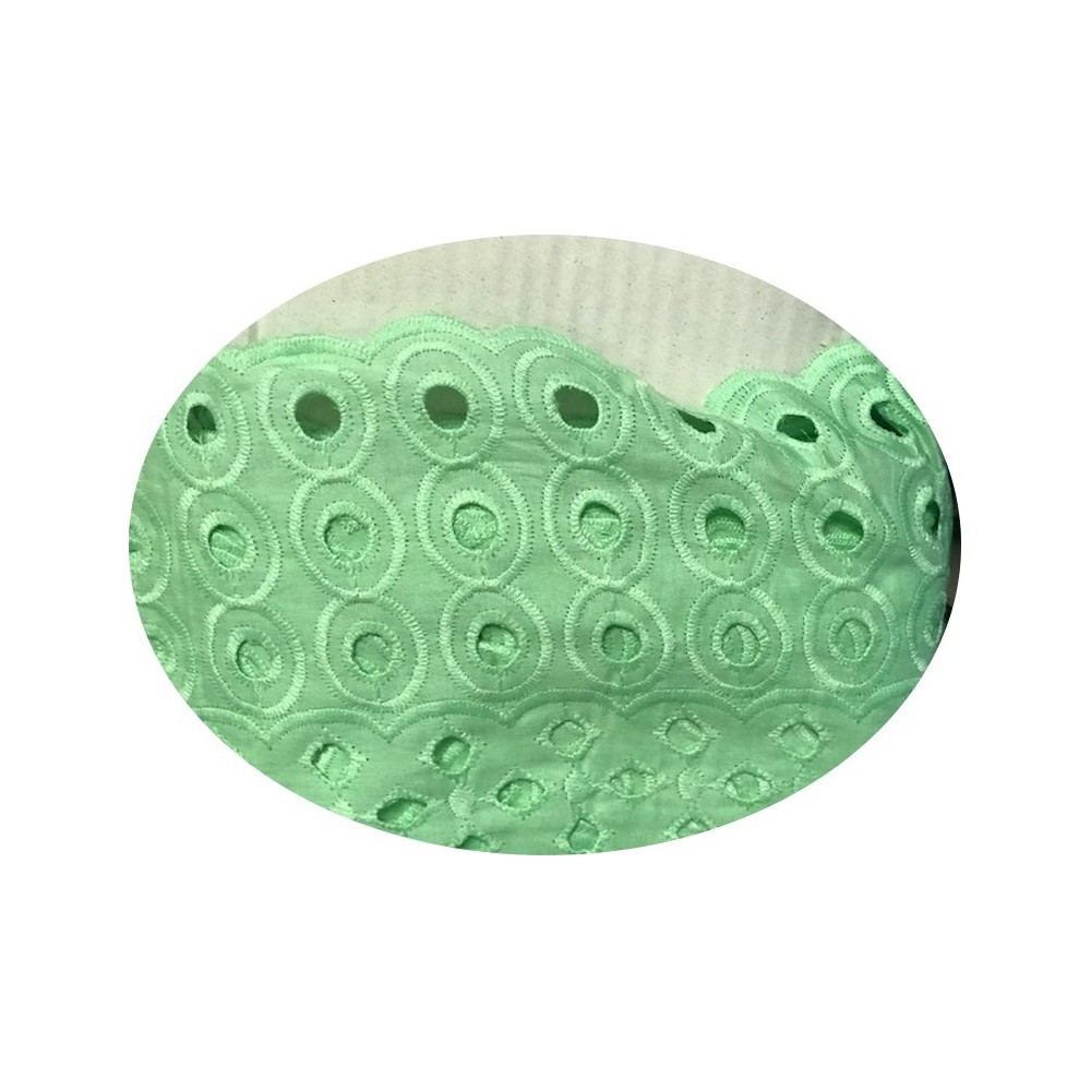 Tissu en Broderie anglaise vert tilleul en grande largeur en coton avec des motifs ajourés en rondelle brodées