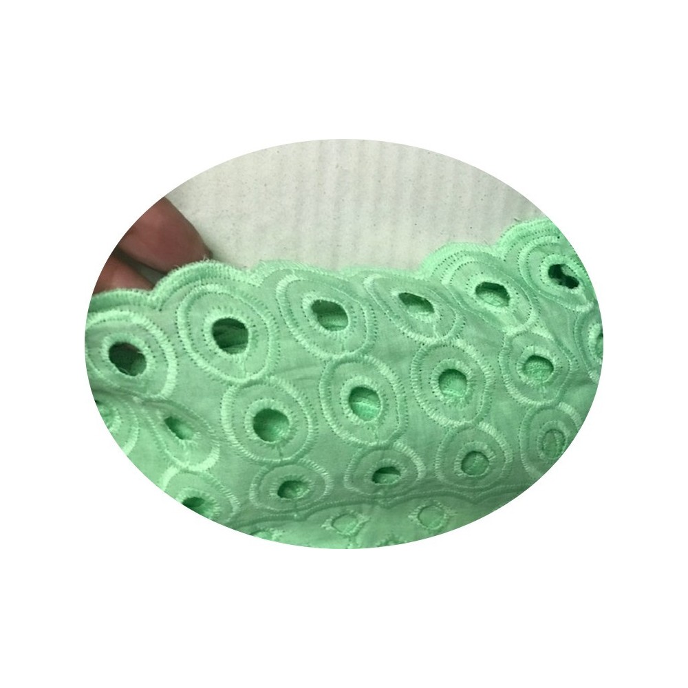 Tissu en Broderie anglaise vert canard en grande largeur en coton avec des motifs ajourés en rondelles et