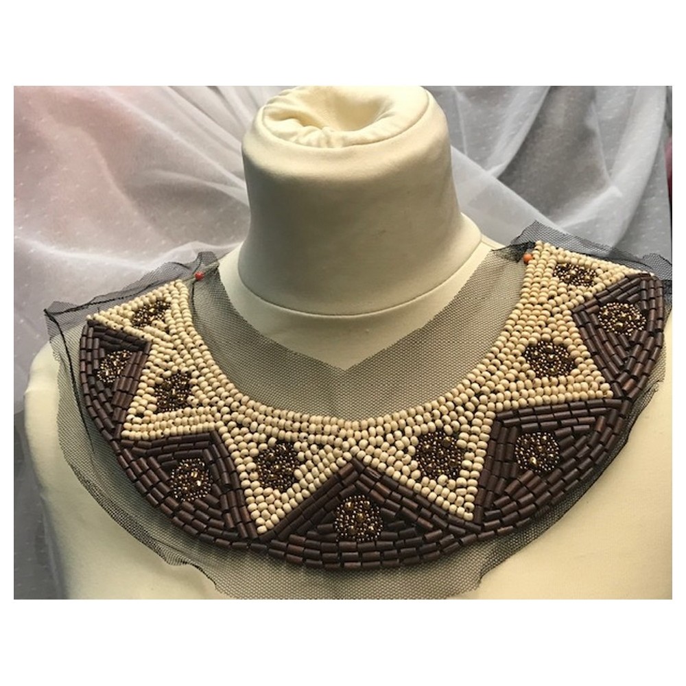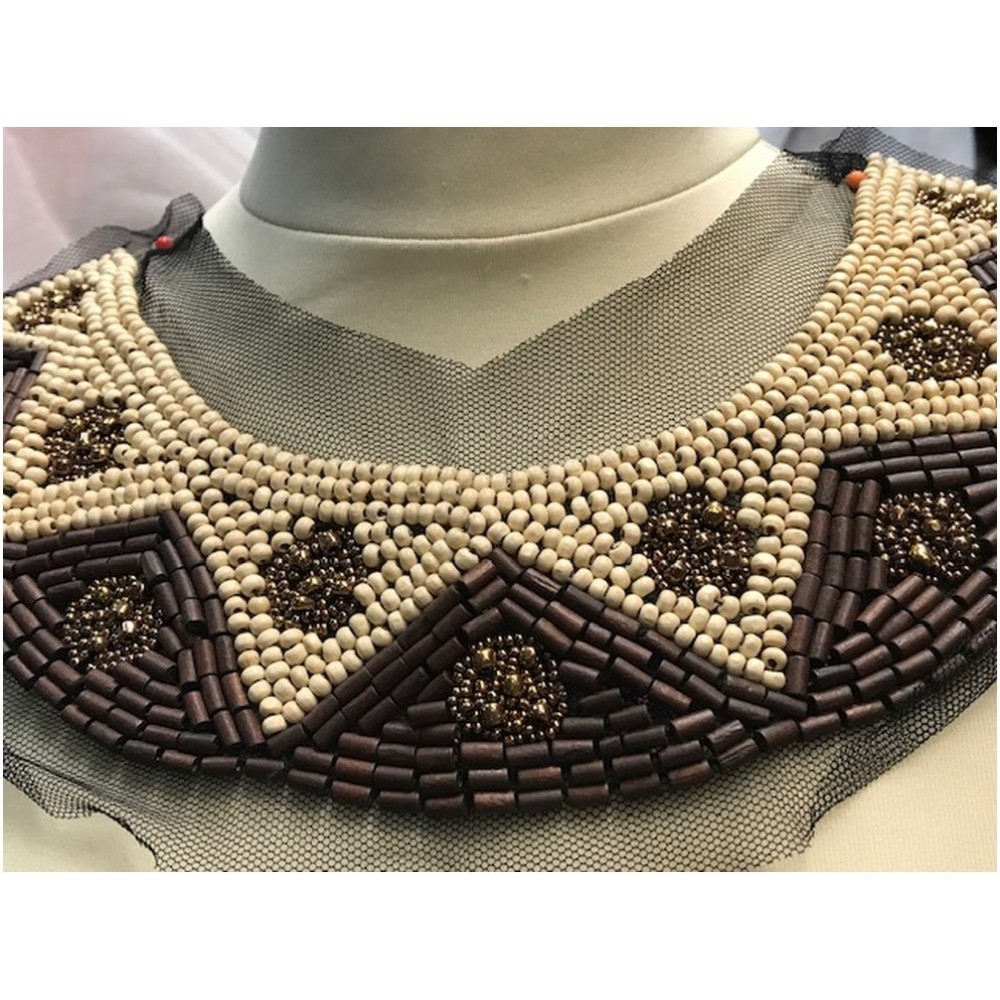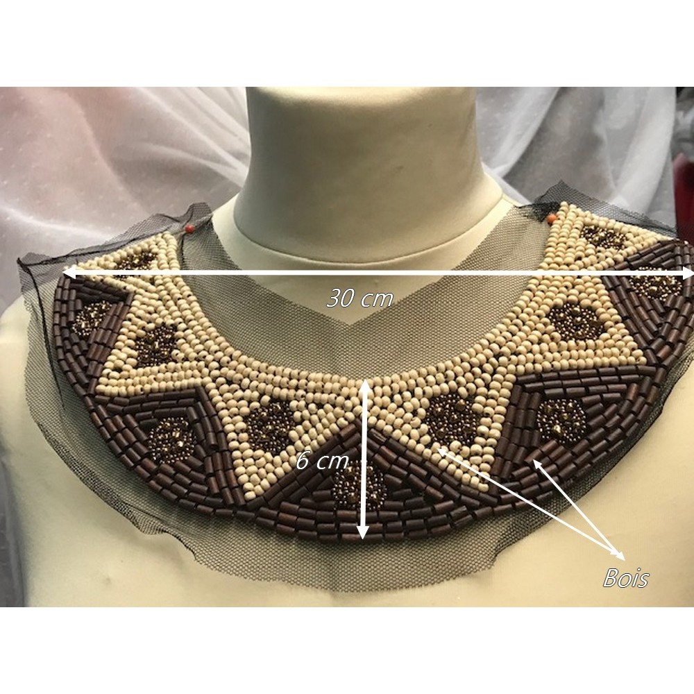 Col à coudre à coudre en perles bois de couleur marron et beige sur tulle noir pour la customisation de robe et de chemisier.