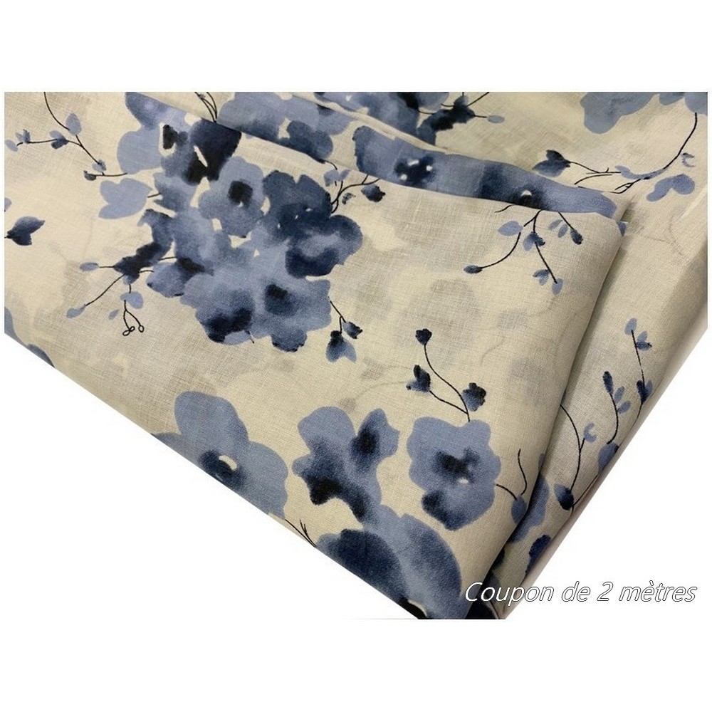 coupon de 2 mètres de Tissu voile de coton Léger au mètre imprimé fleurs de couleur bleu indigo sur fond écru rayure