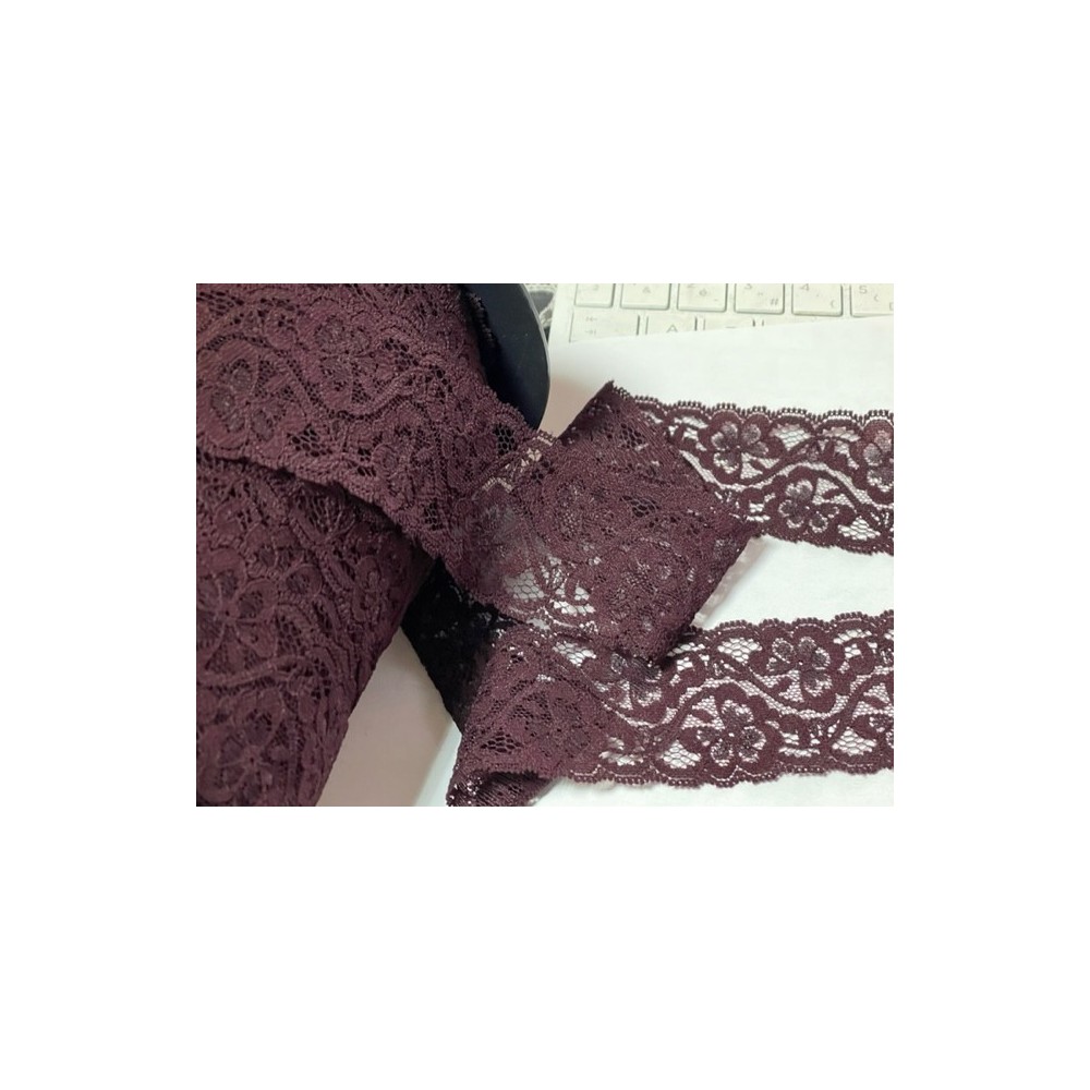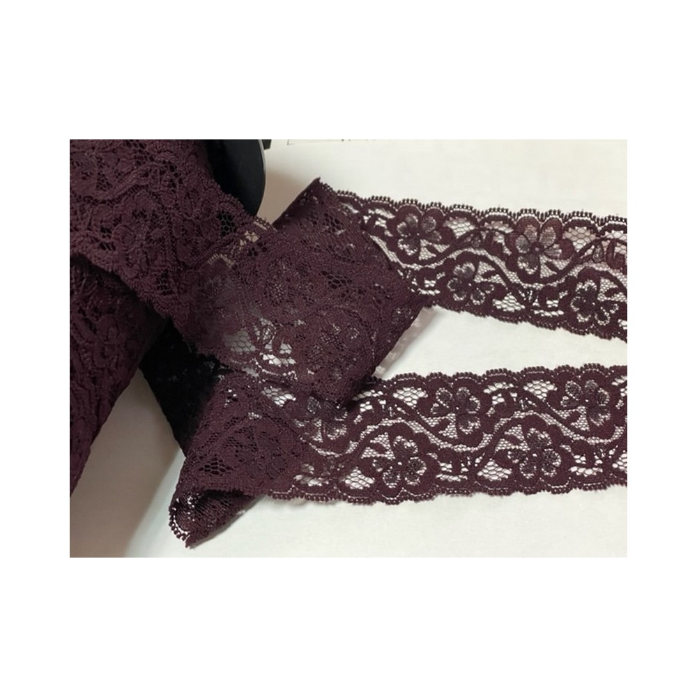 Dentelle lycra en 7 cm festonné en couleur bordeaux lie de vin, de calais brodé sur les contours de fleurs
