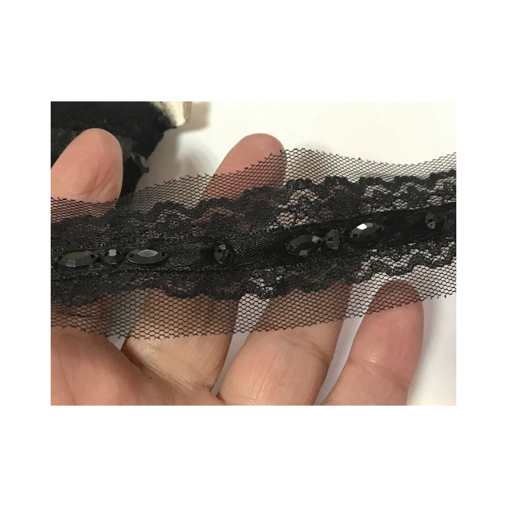 Dentelle perlé noir sur résille à coudre, dentelle orné de perles noir