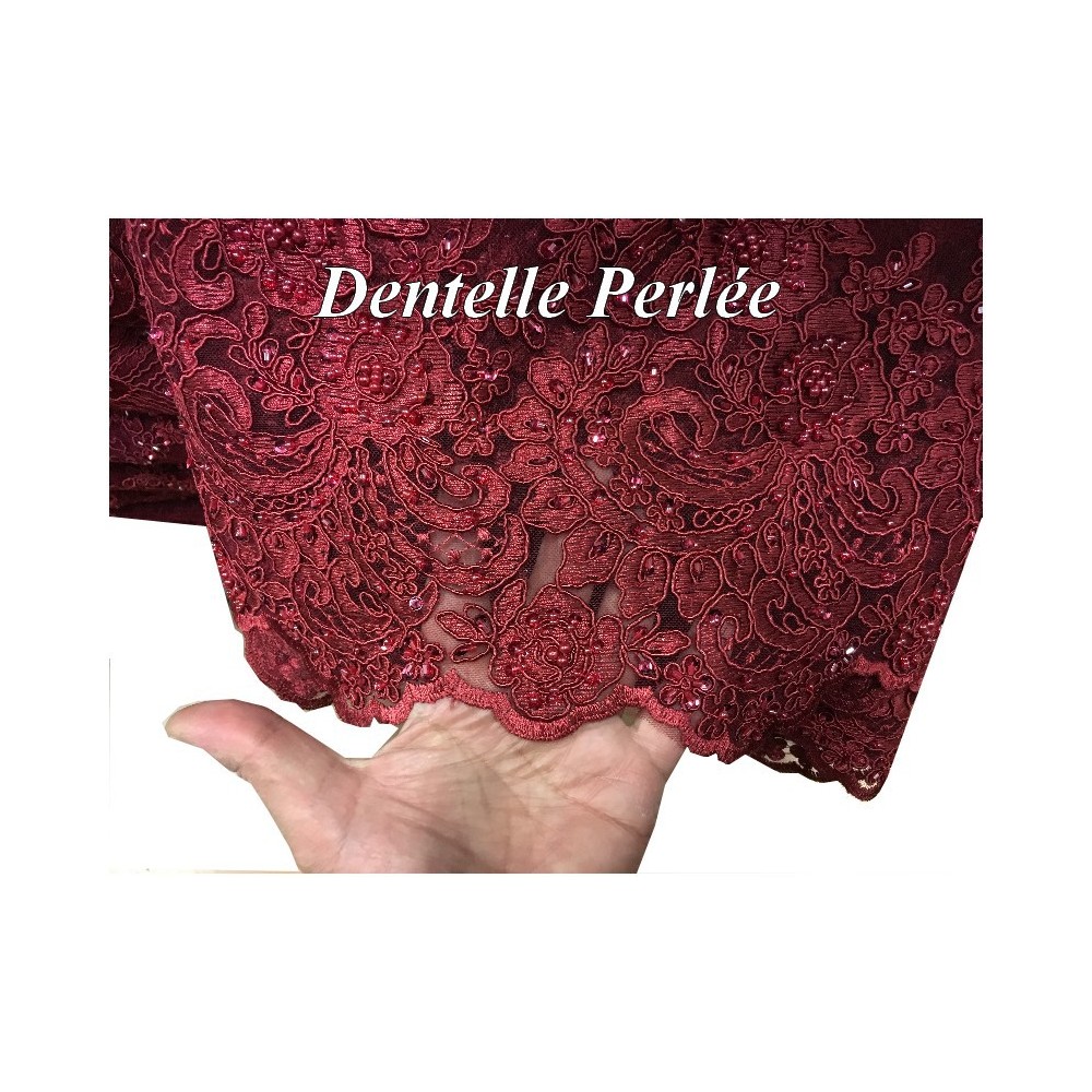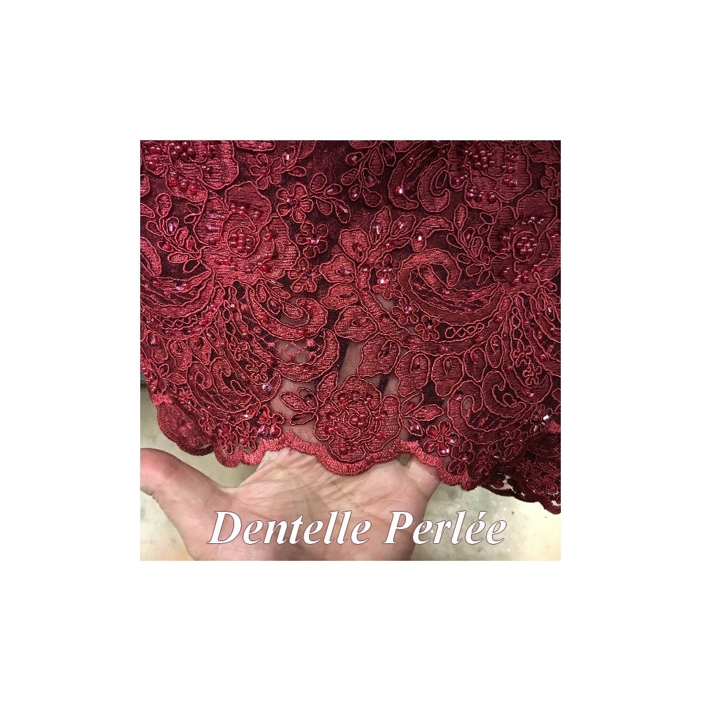 Dentelle en Perles au Mètre bordeaux sur tulle , en Grande Largeur.
