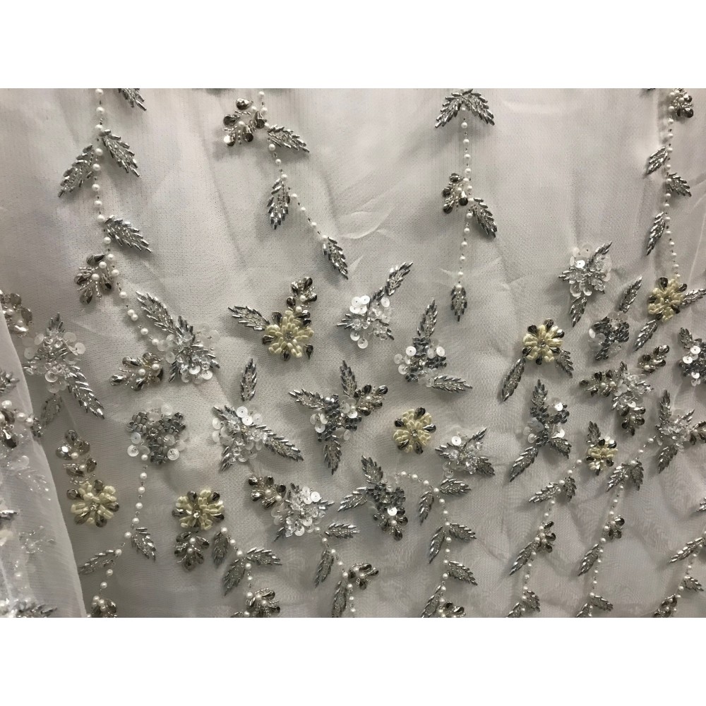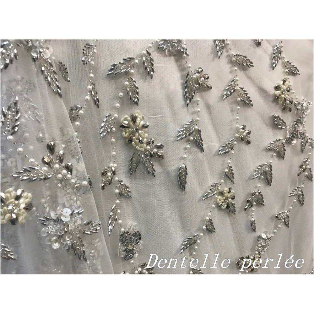 Cette dentelle perlée , ornée de motifs fleurs et de motifs en forme de feuilles en tissu brodé de perles couleurs blanche, est tout simplement époustouflante. Avec sa haute qualité et sa grande largeur de 1 mètre 45, ce tissu en dentelle perlé blanc est idéal pour les robes de mariée, les voiles ou les décorations pour votre mariage.