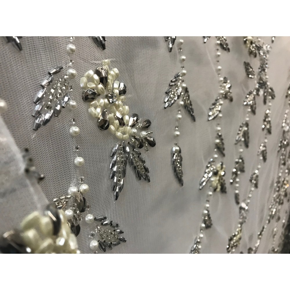 Très beau tissu haute couture sut tulle brodé, orné de perles et strass sur toute la longueur.