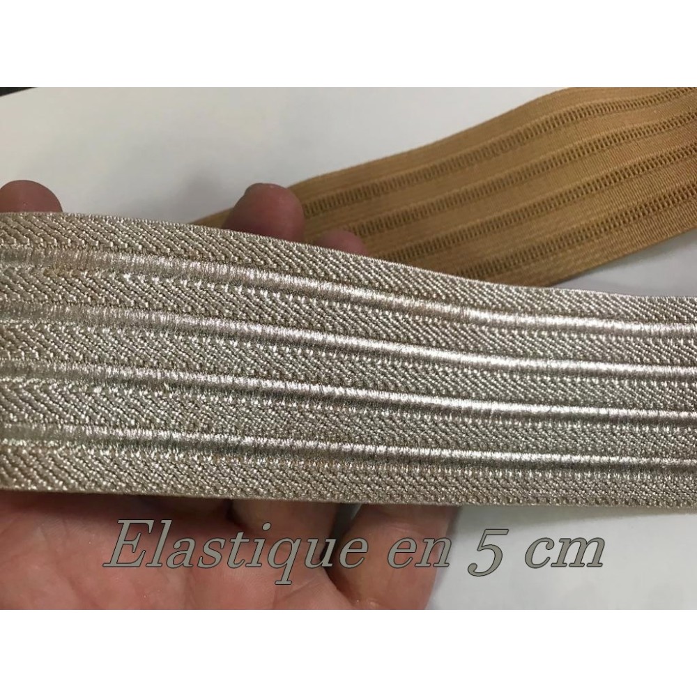 Elastique fantaisie argent plat couture en 5 cm de largeur pour fabrication de ceintures, confection de vêtements, décorations de robes, pour jupes pantalon, slips, lingerie, sacs.