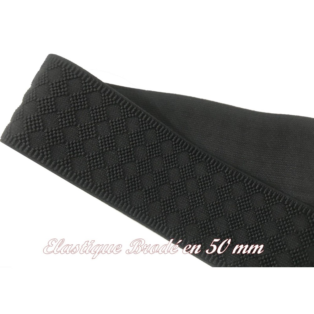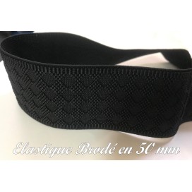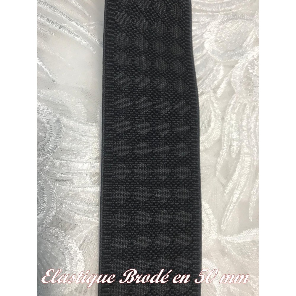 Ruban gomme élastique plat brodé en couleur noir en 50 mm pour la couture et la mercerie.