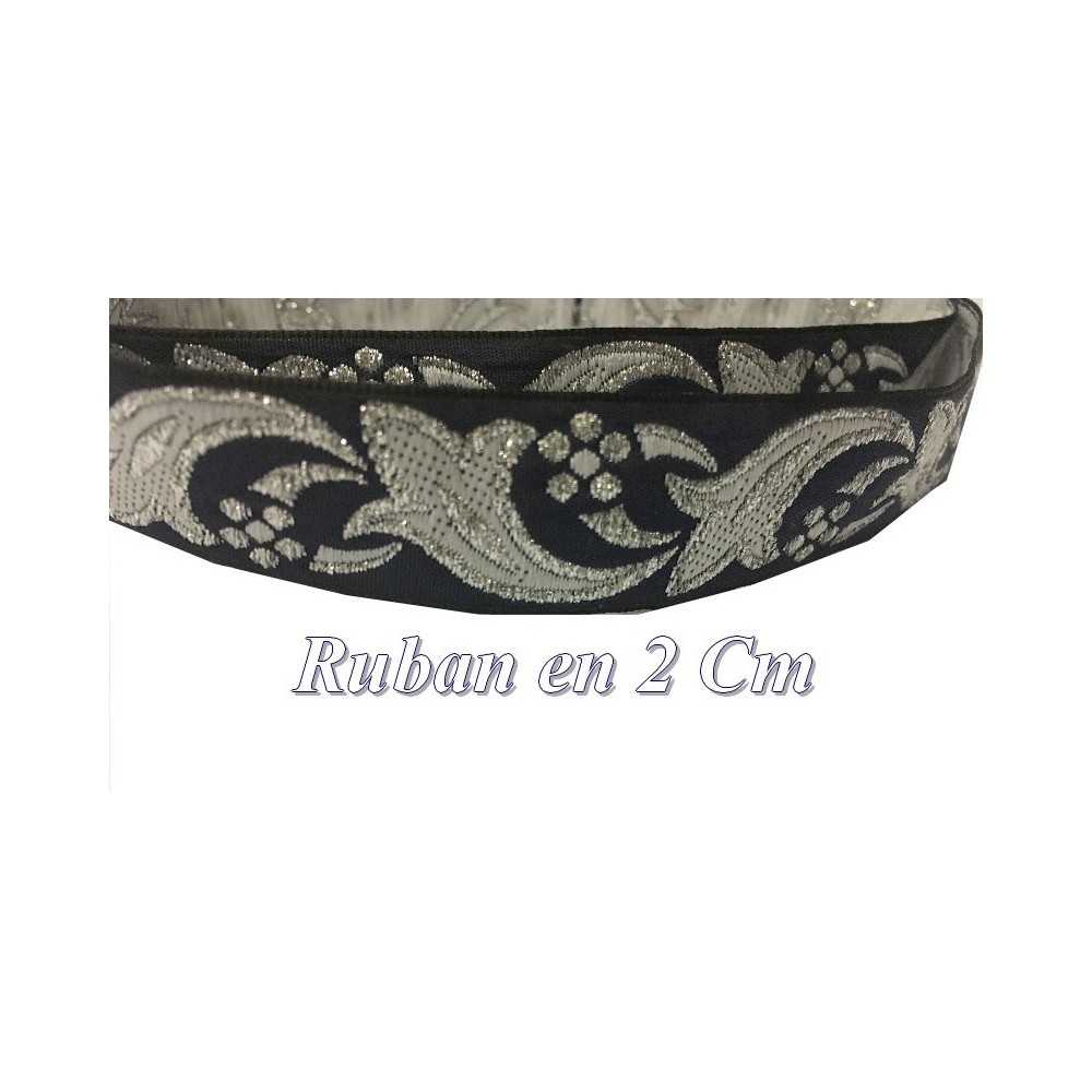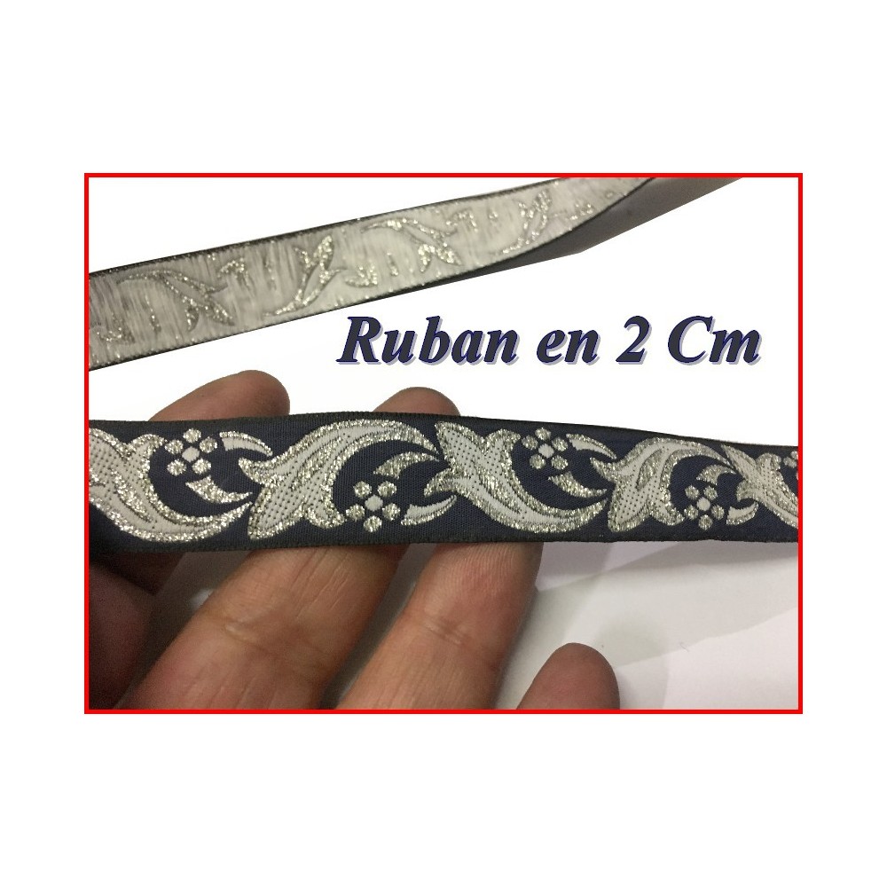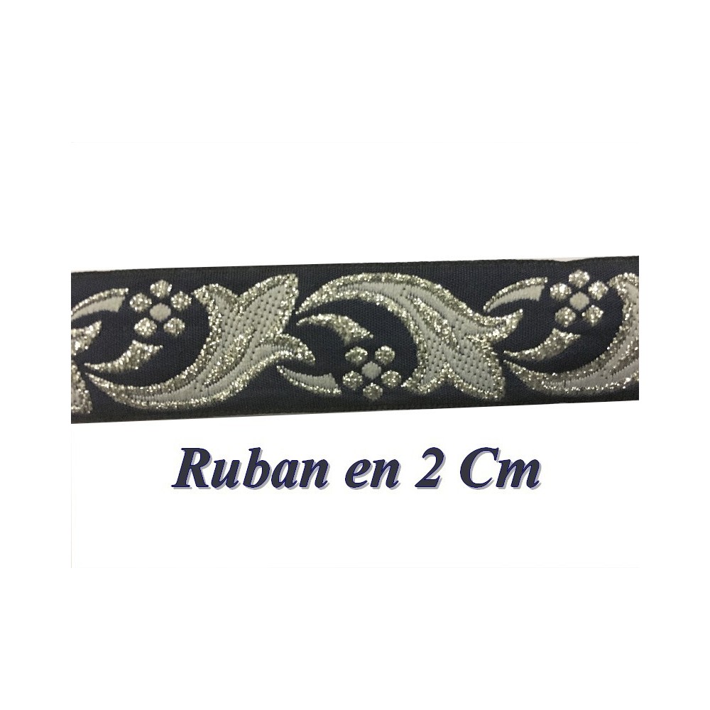 Galon ruban fantaisie avec des motifs argent sur fond bleu marine, avec une belle finition sur les cotées.