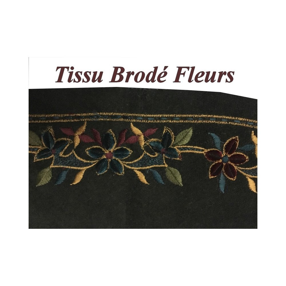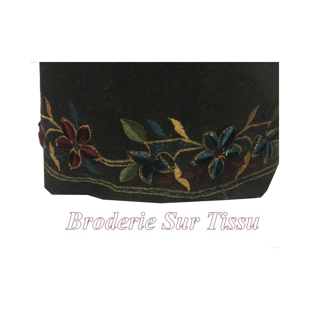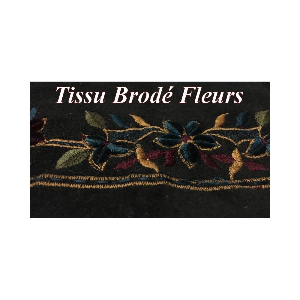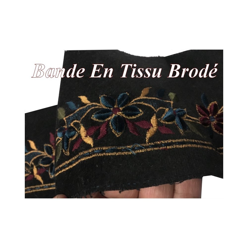 Tissu en bande brodé sur velours noir pour la customisations de vetements, de blousons jeans, de tee-shirt, de pantalon, de robes, caftans, cols, manches, ceintures, loisirs créatifs, chemisiers, sacs, pochettes, chapeaux.