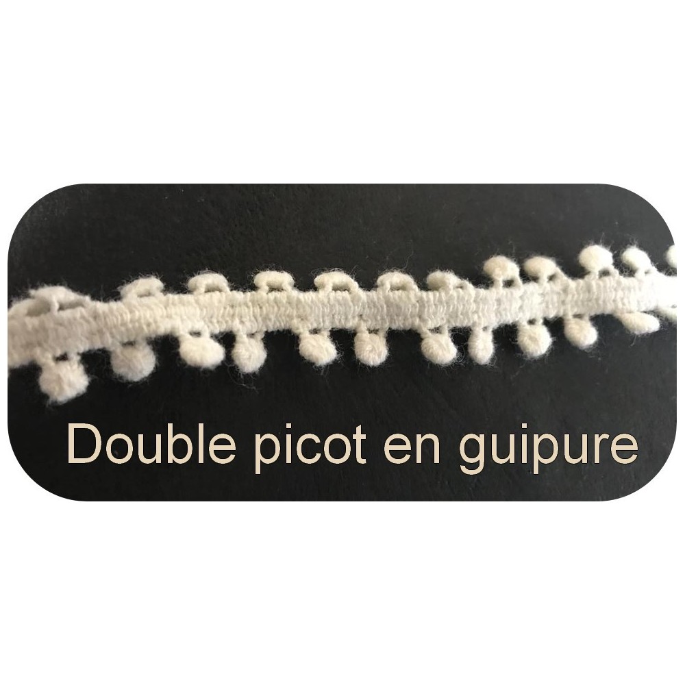 Le picot en guipure est un type de dentelle délicate, souvent réalisée à la main, qui présente des motifs ornementaux complexes et des bords festonnés. Avec son double picot, ce détail devient encore plus remarquable, ajoutant une dimension supplémentaire à vos projets de couture.