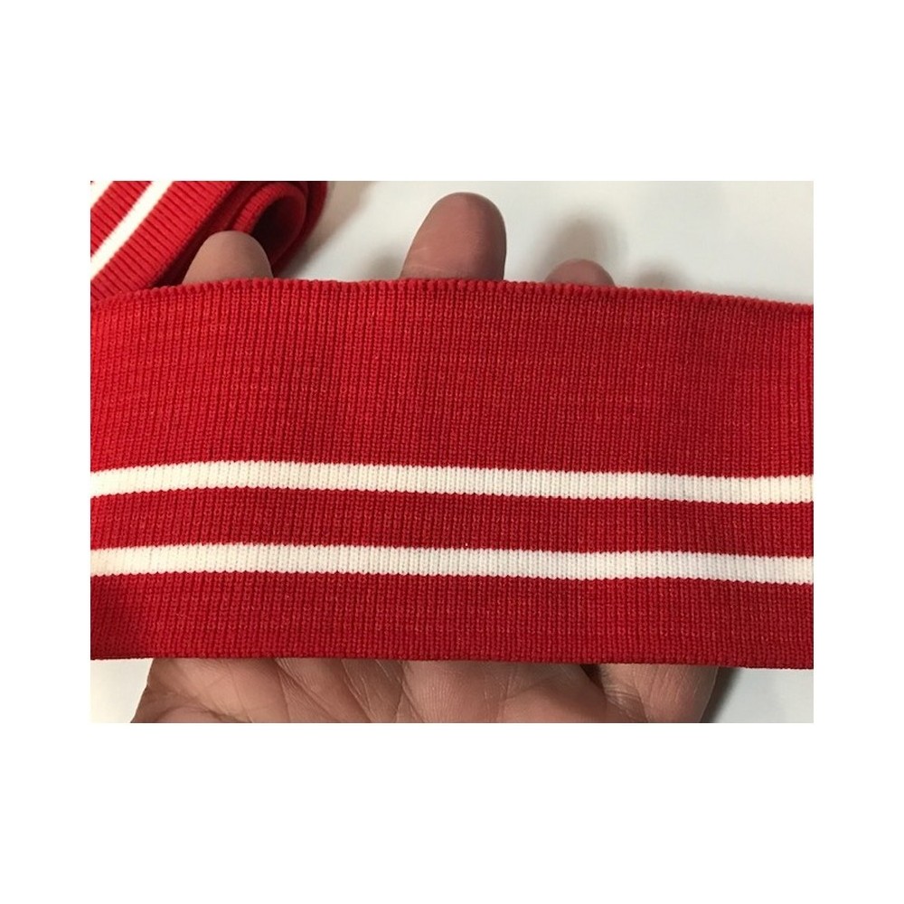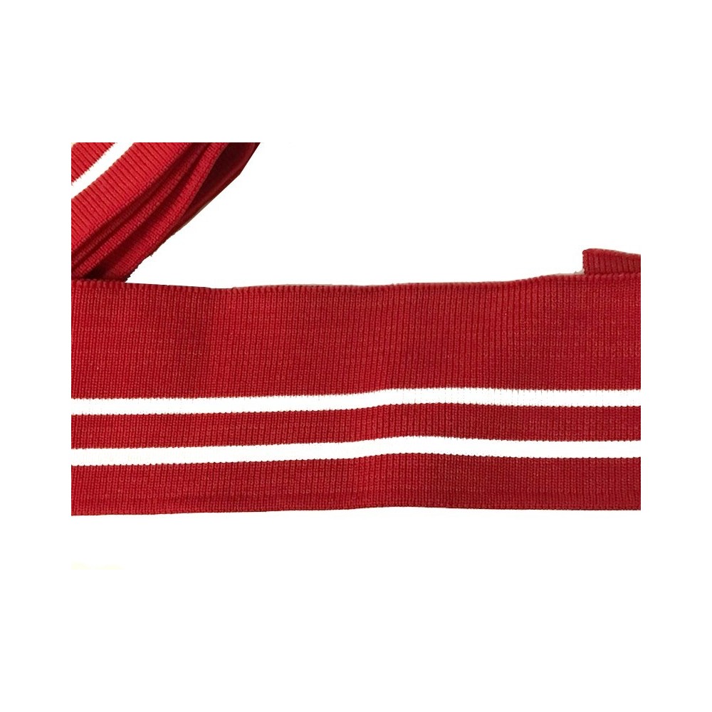 Tissu en bande élastique en jersey de couleur rouge à rayure blanche pour poignée, manchette, cols, finitions.