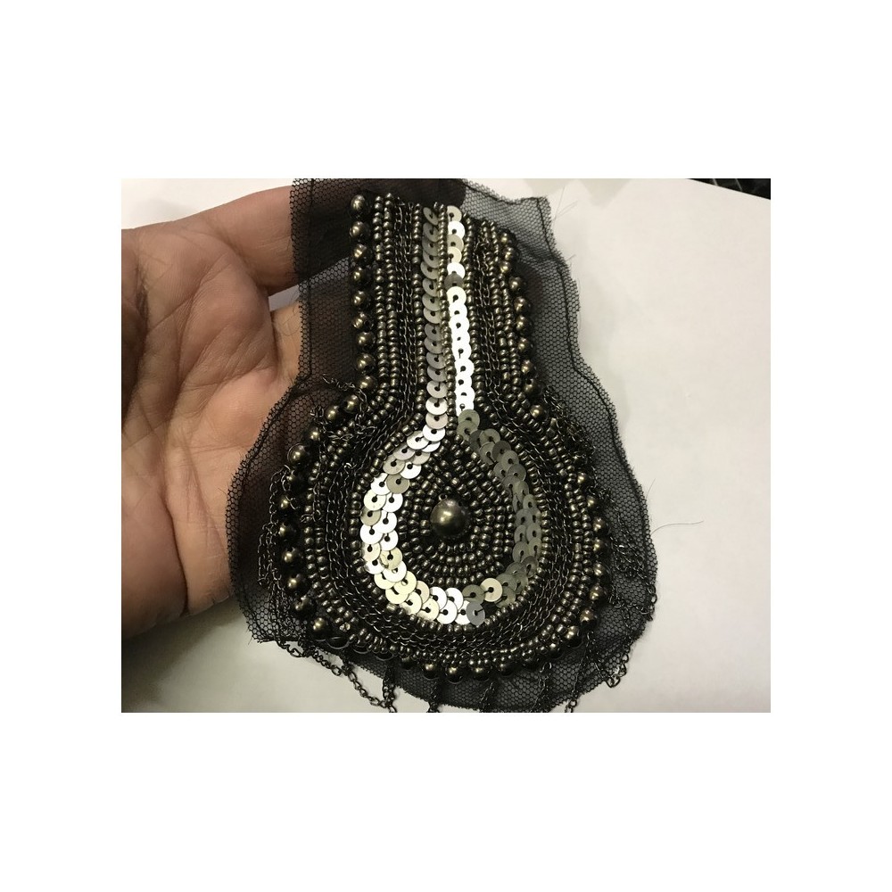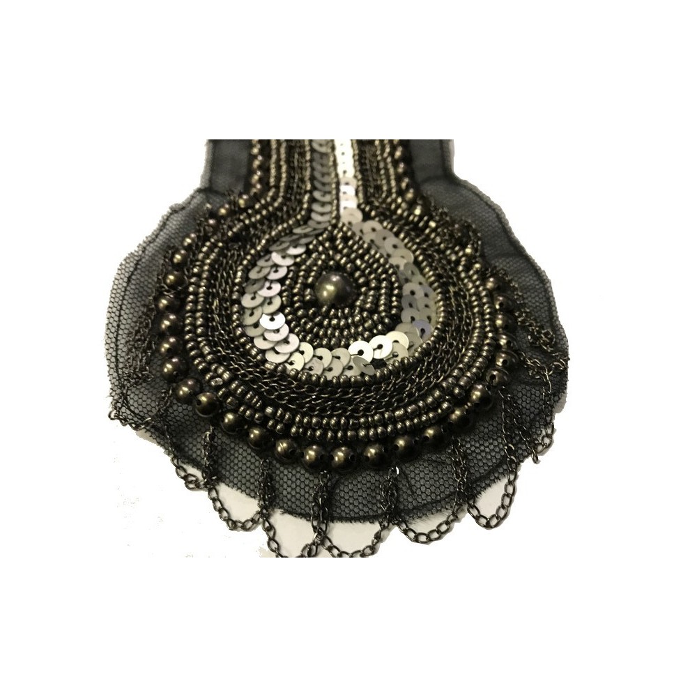 Applique épaulette patch en perle et Sequinargent sur tulle noir orné de chainette