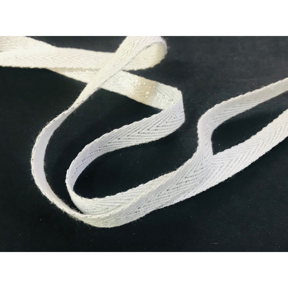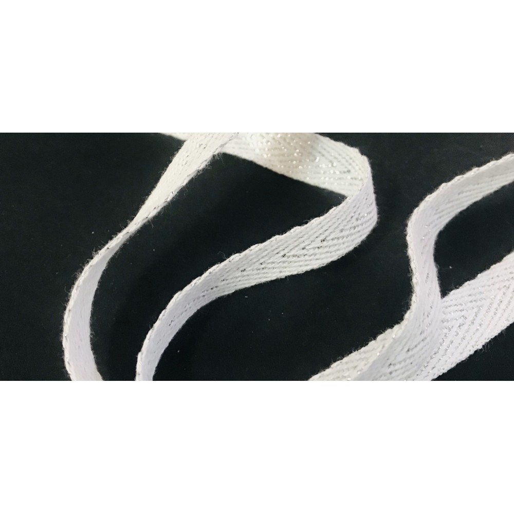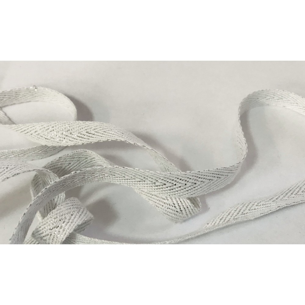 Fournitures ruban sergé argenté blanc idéal pour loisirs créatifs, customisations, caftan, décorations, chapeaux, vestes, jupes, pantalons, sacs, pochettes, figurines, poupées, attaches, bretelles, chaussures, lingerie.