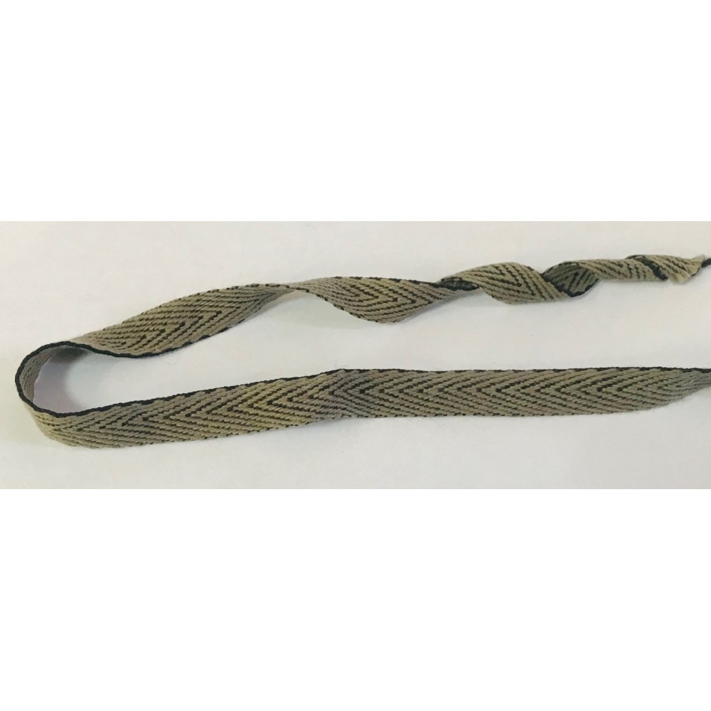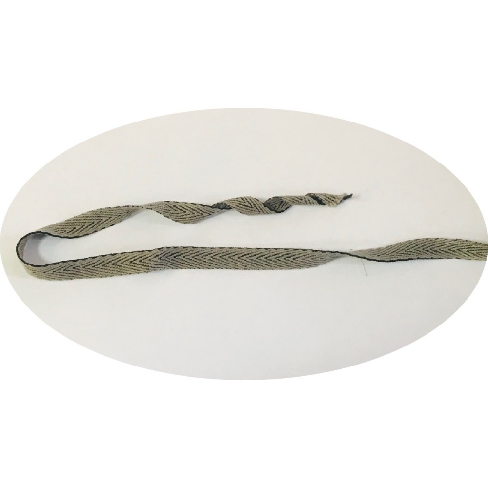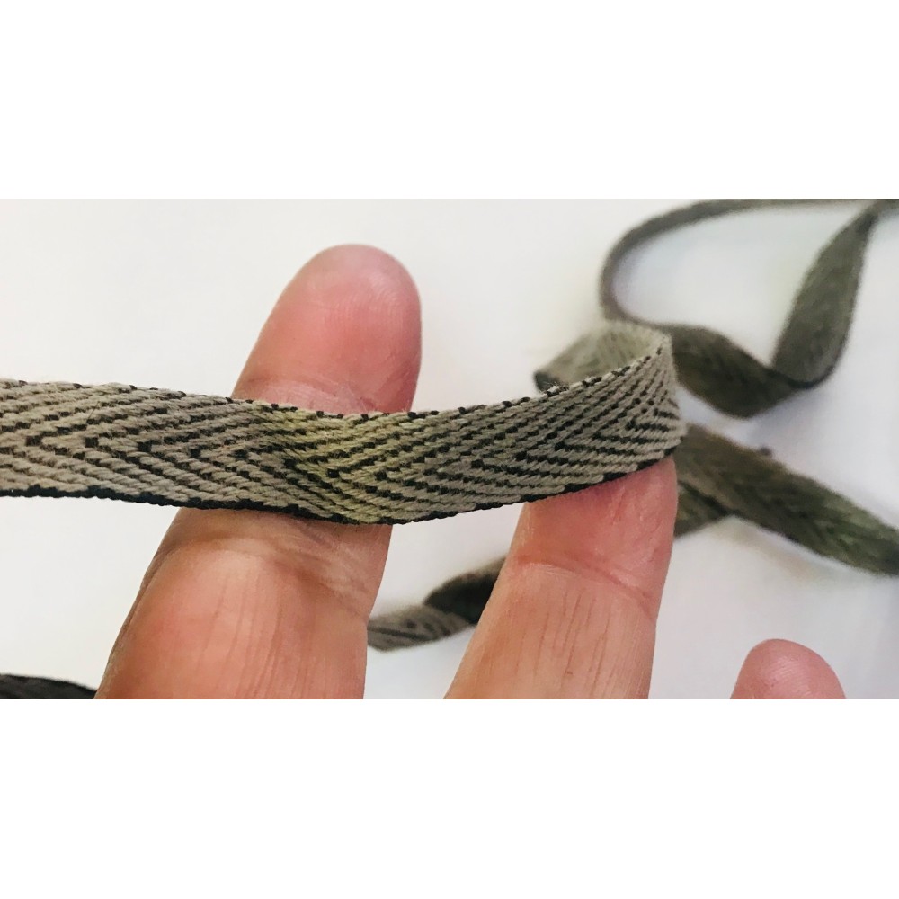 Ruban sergé coton au mètre en bande de couleur kaki en 15 mm pour décorations, souple et facile à coudre.