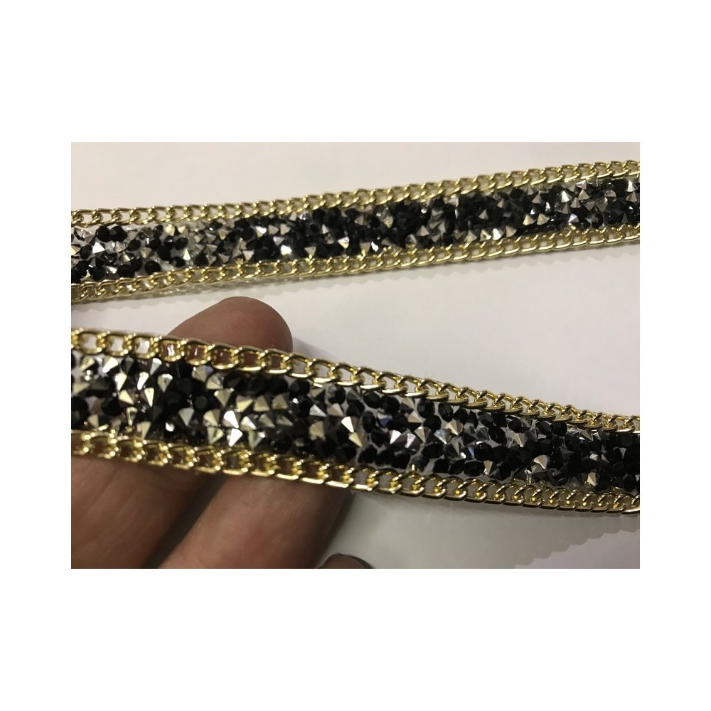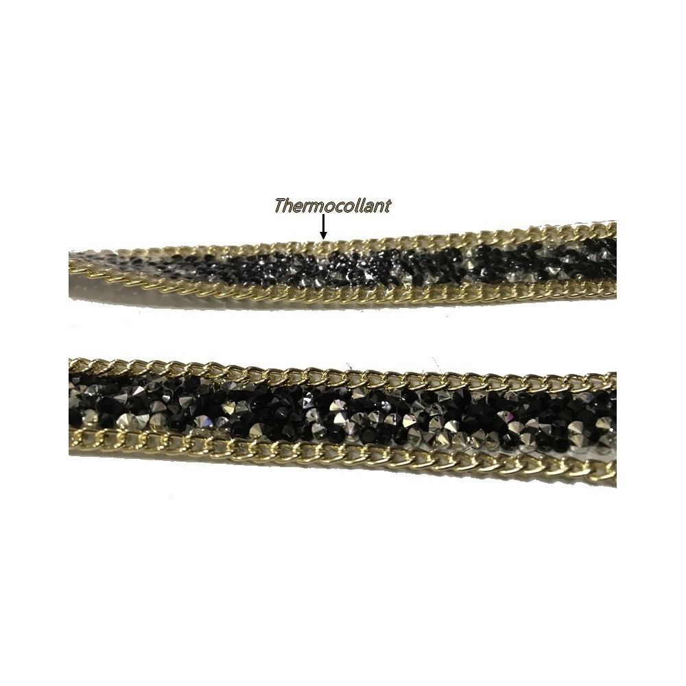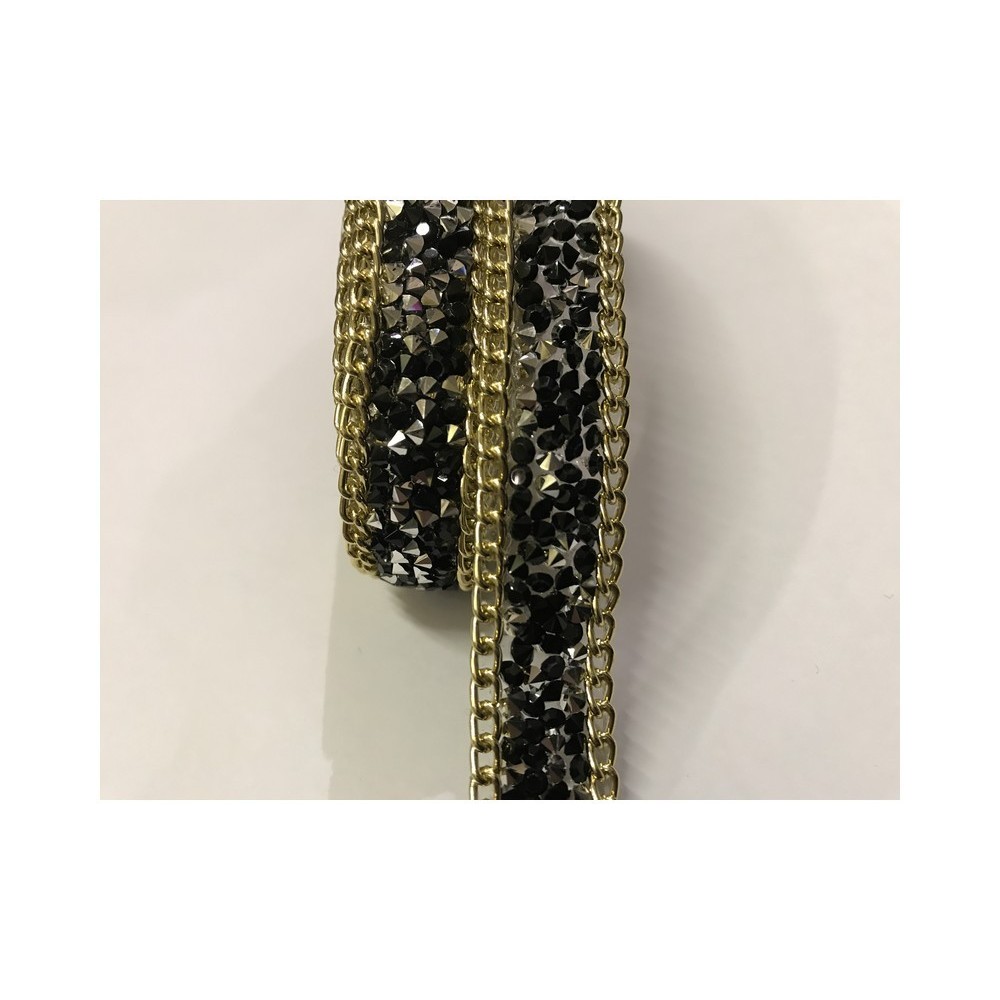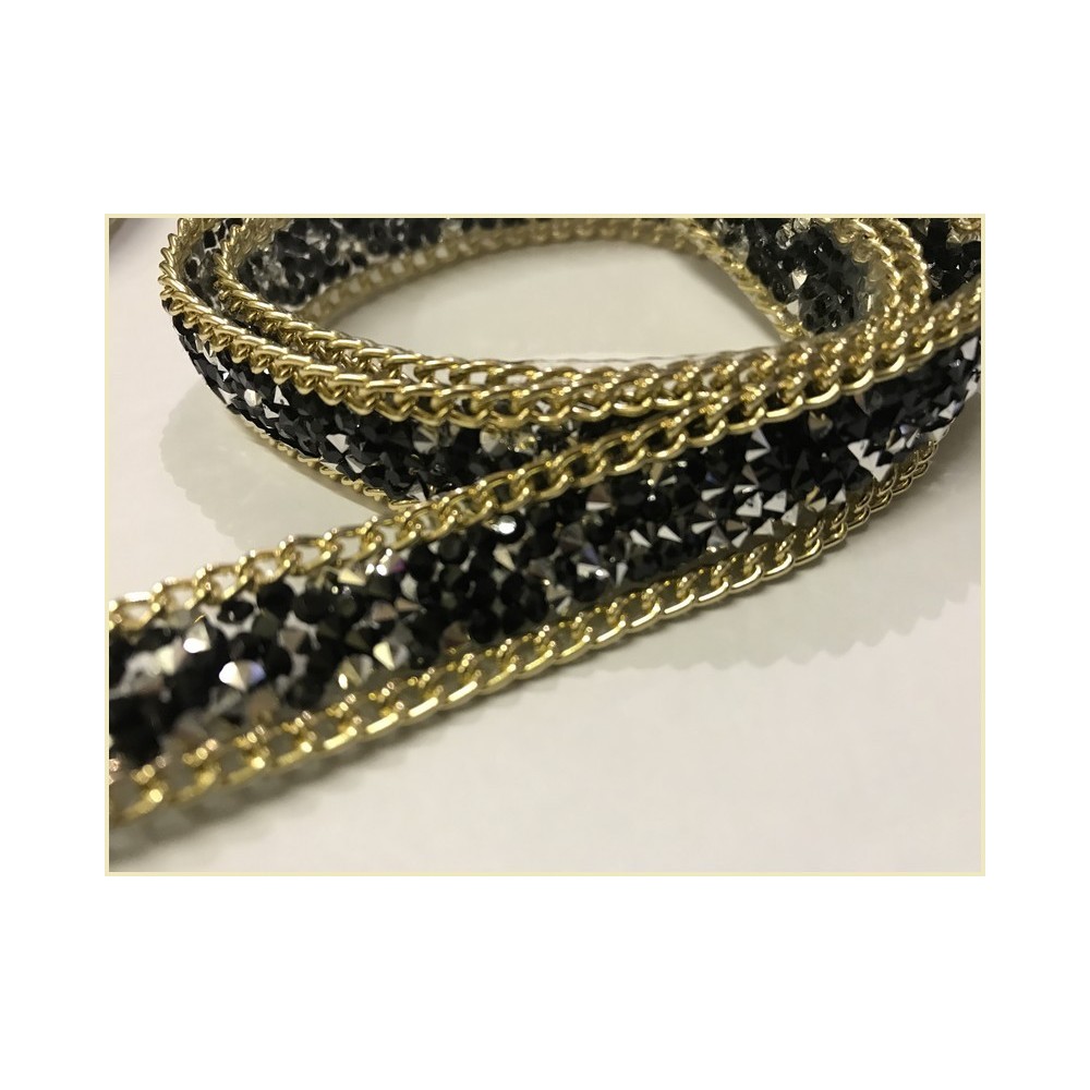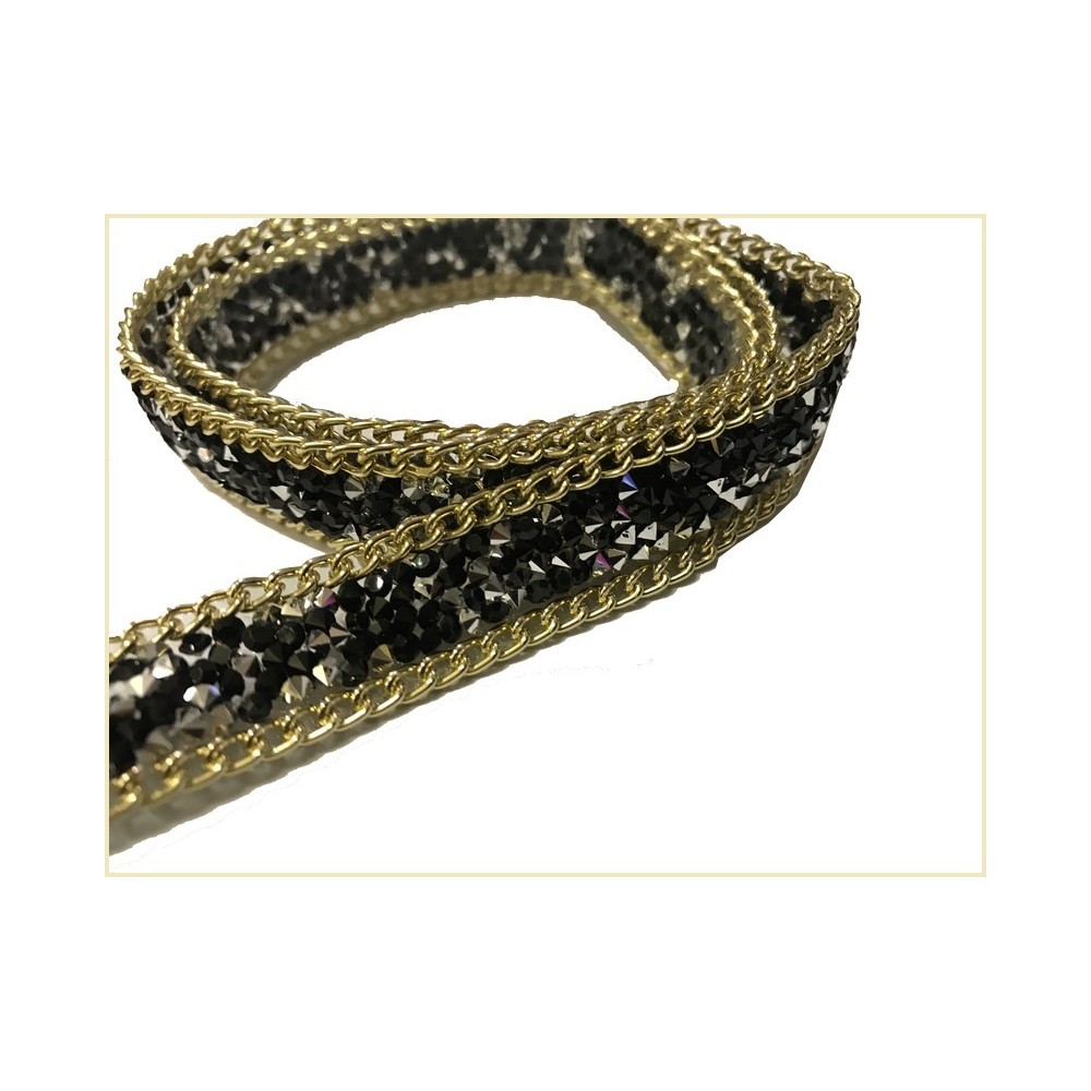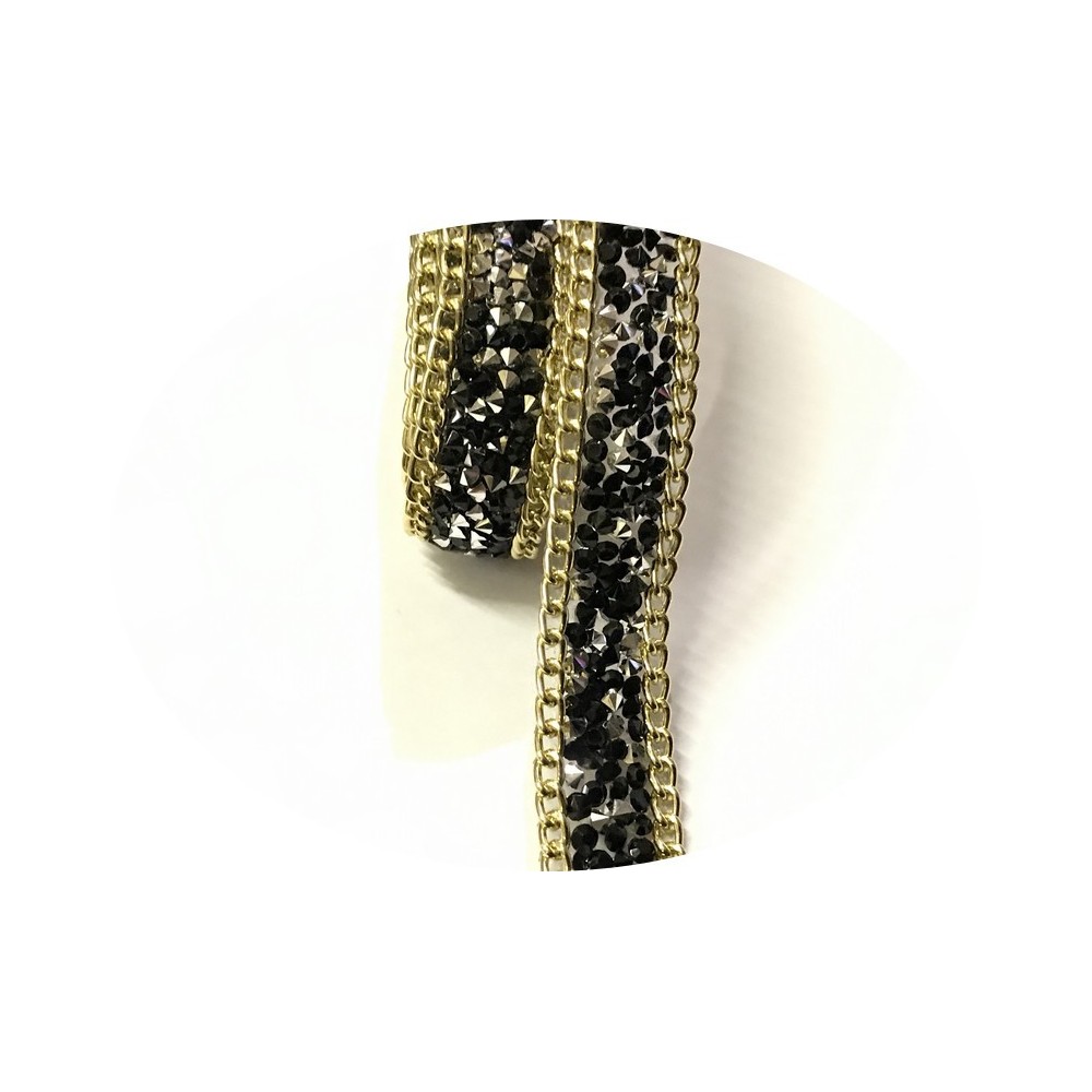 Ruban strass au mètre noir orné de chaine doré or sur les éxtrémitées, et de pierre noir