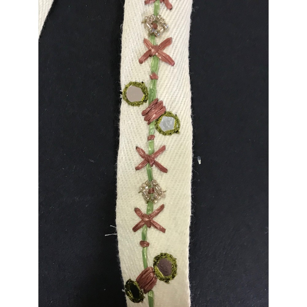 Ruban en sergé écru orné de petit miroir et de petites perles au mètre avec un effet en couture en raffia
