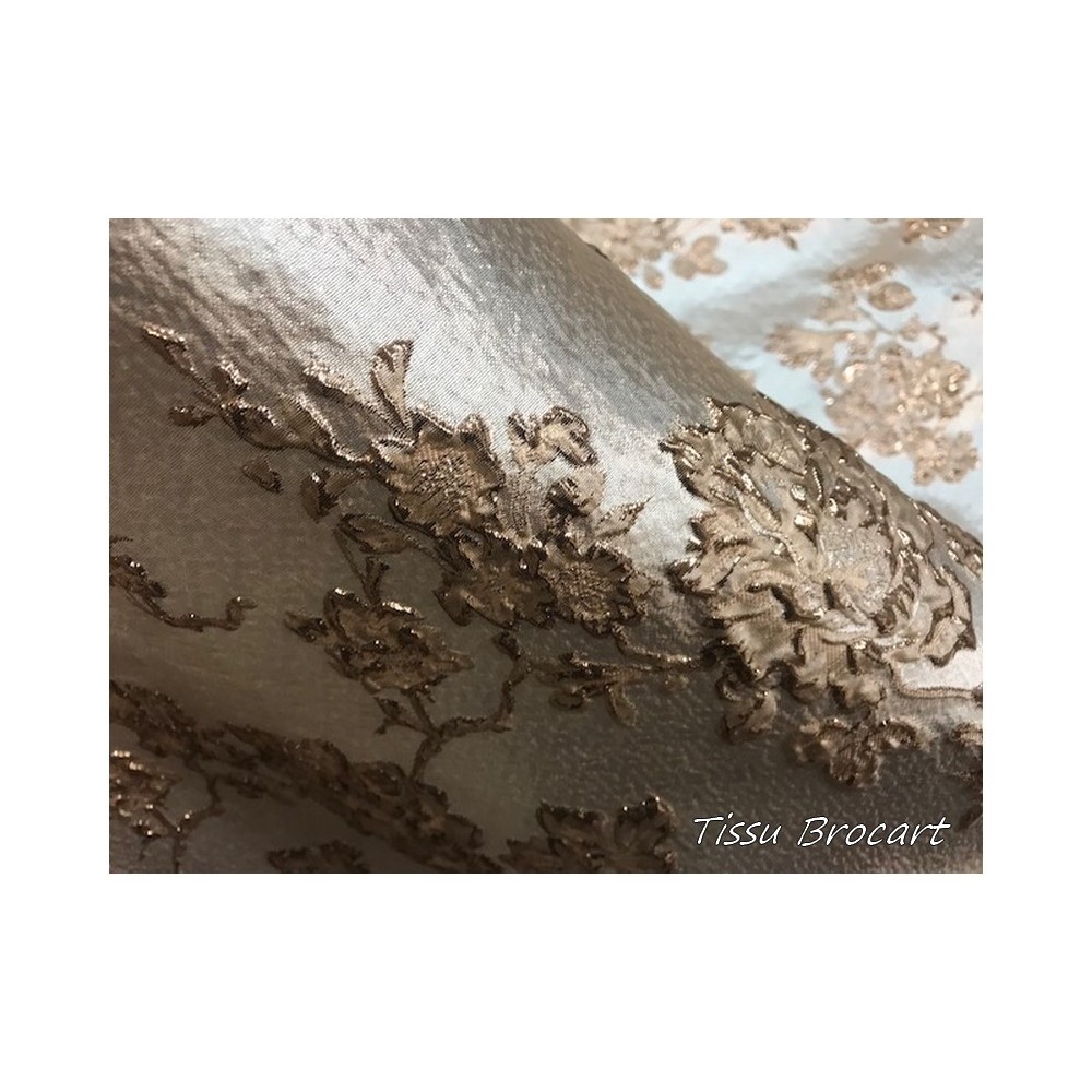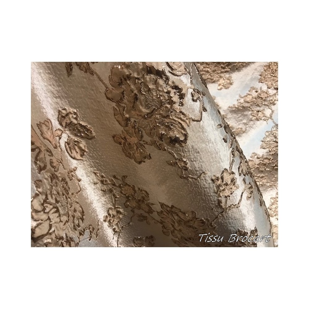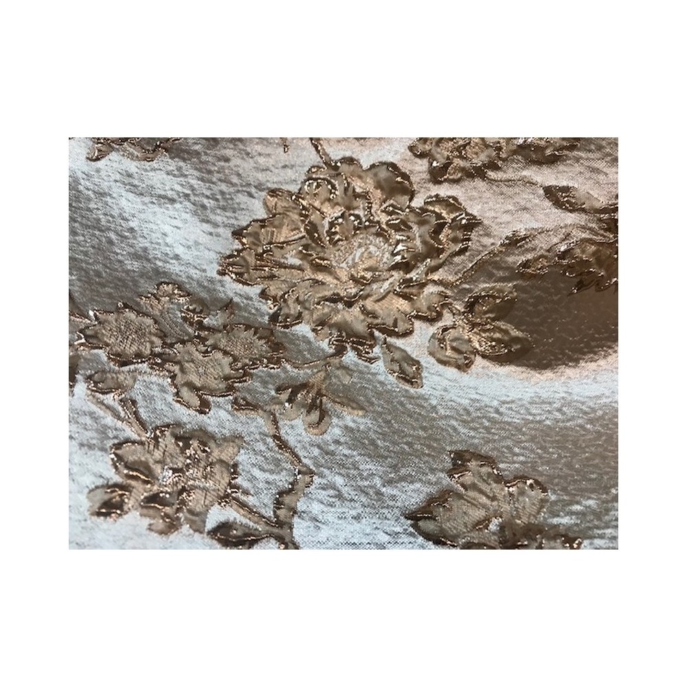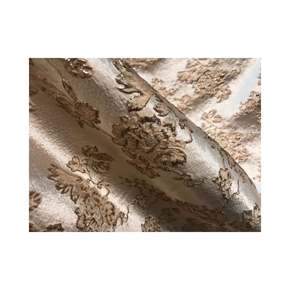 Tissu brocart au mètre de haut gamme, imprimé de motifs fleurs doré or sur un fond or, avec un beau touché de soie.