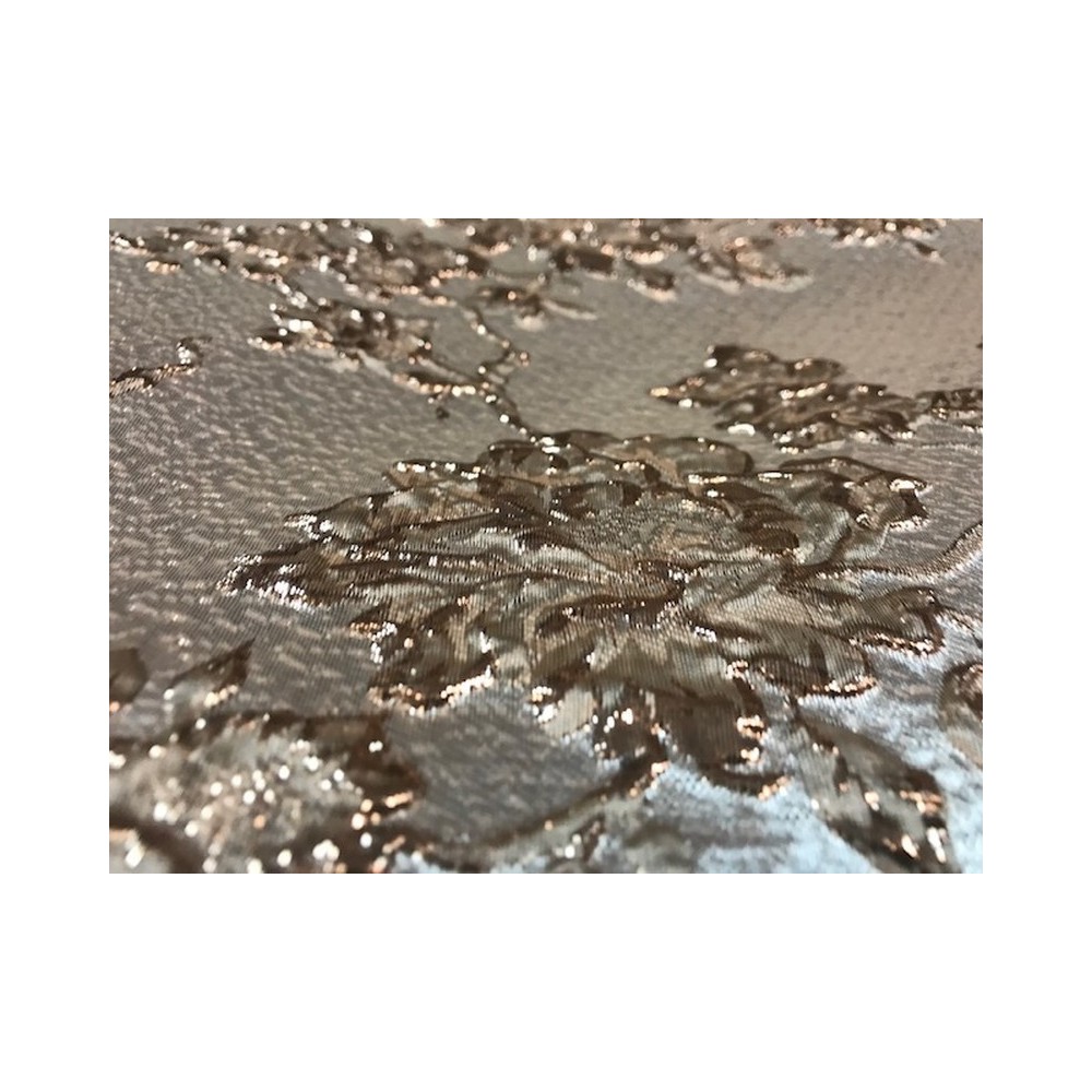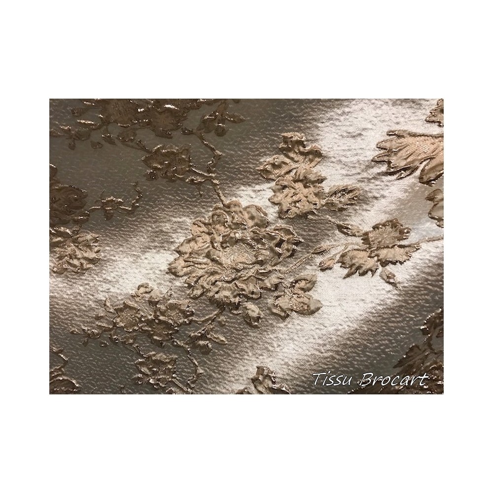 Tissu brocart au mètre de haut gamme, imprimé de motifs fleurs floqués de couleur argent sur un fond en tissu organza , avec un beau touché de soie.