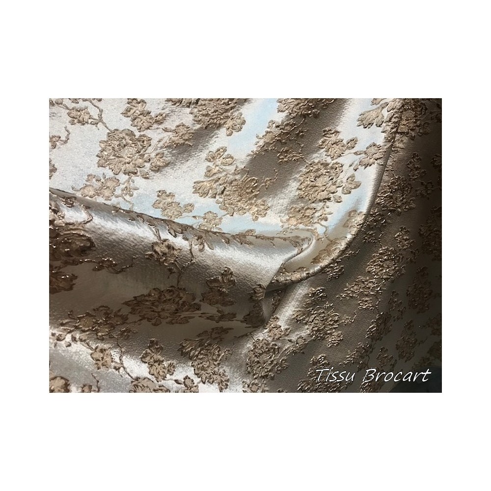 Tissu brocart au mètre de haut gamme, imprimé de motifs fleurs bleu ciel et doré or sur un fond ciel, avec un beau touché de soie.