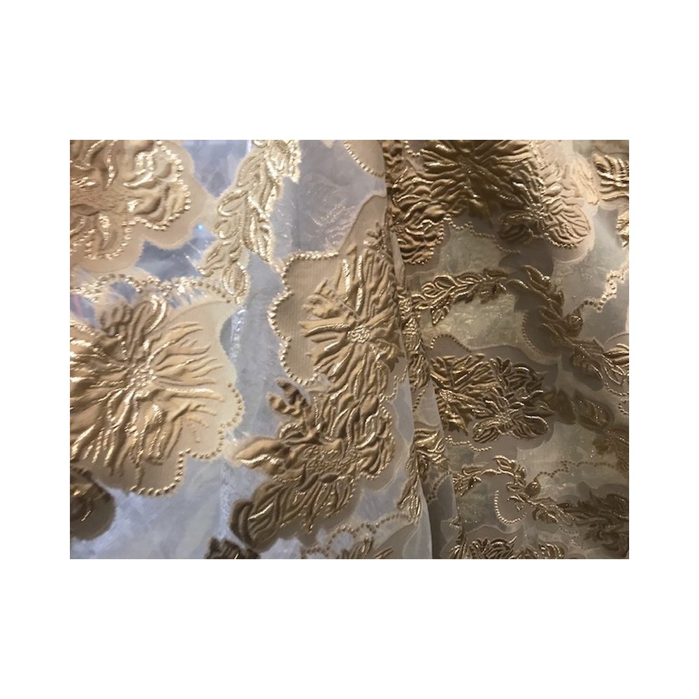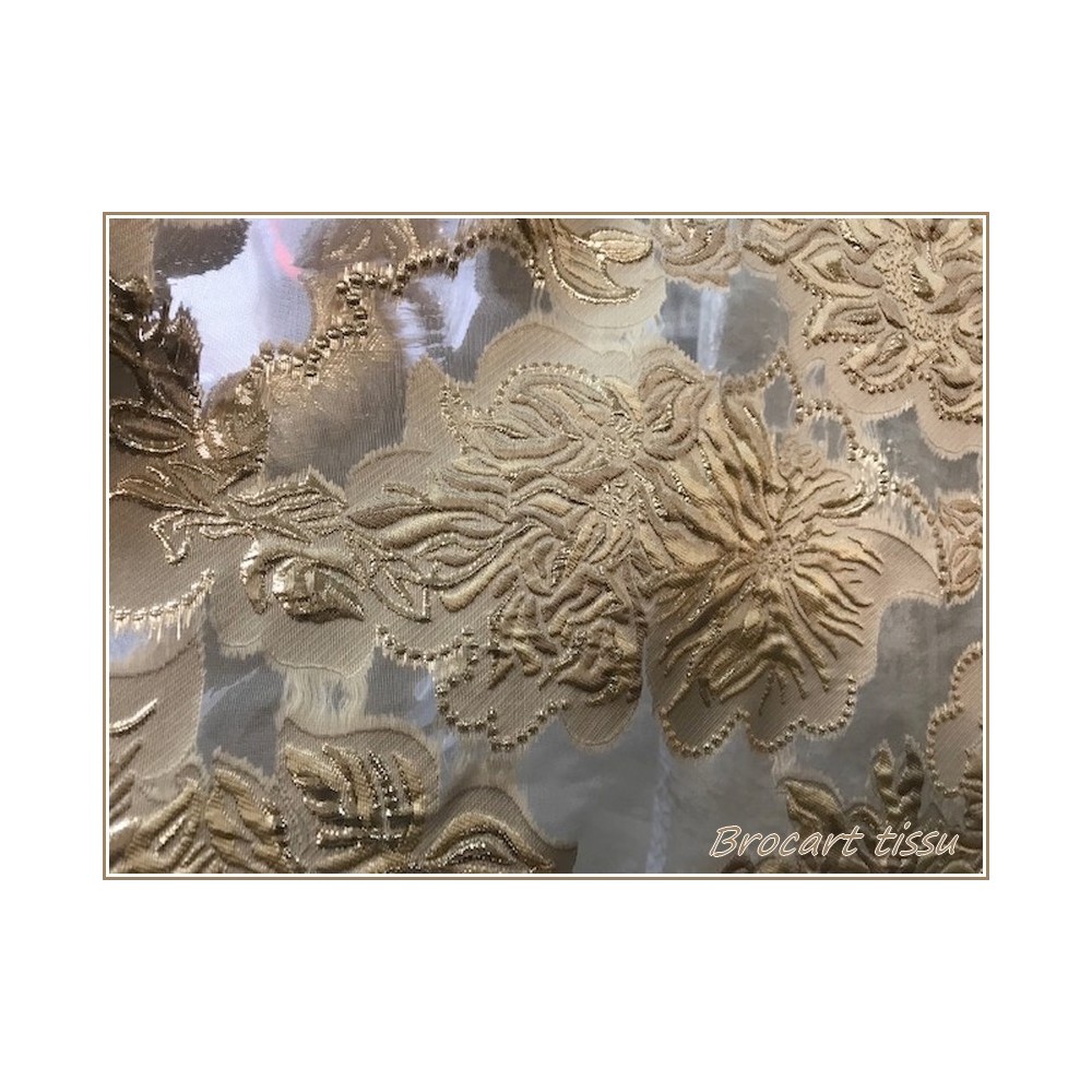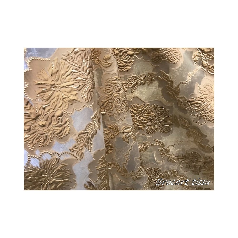 Tissu brocart au mètre de haut gamme, imprimé de motifs fleurs doré or sur un fond or, avec un beau touché de soie.