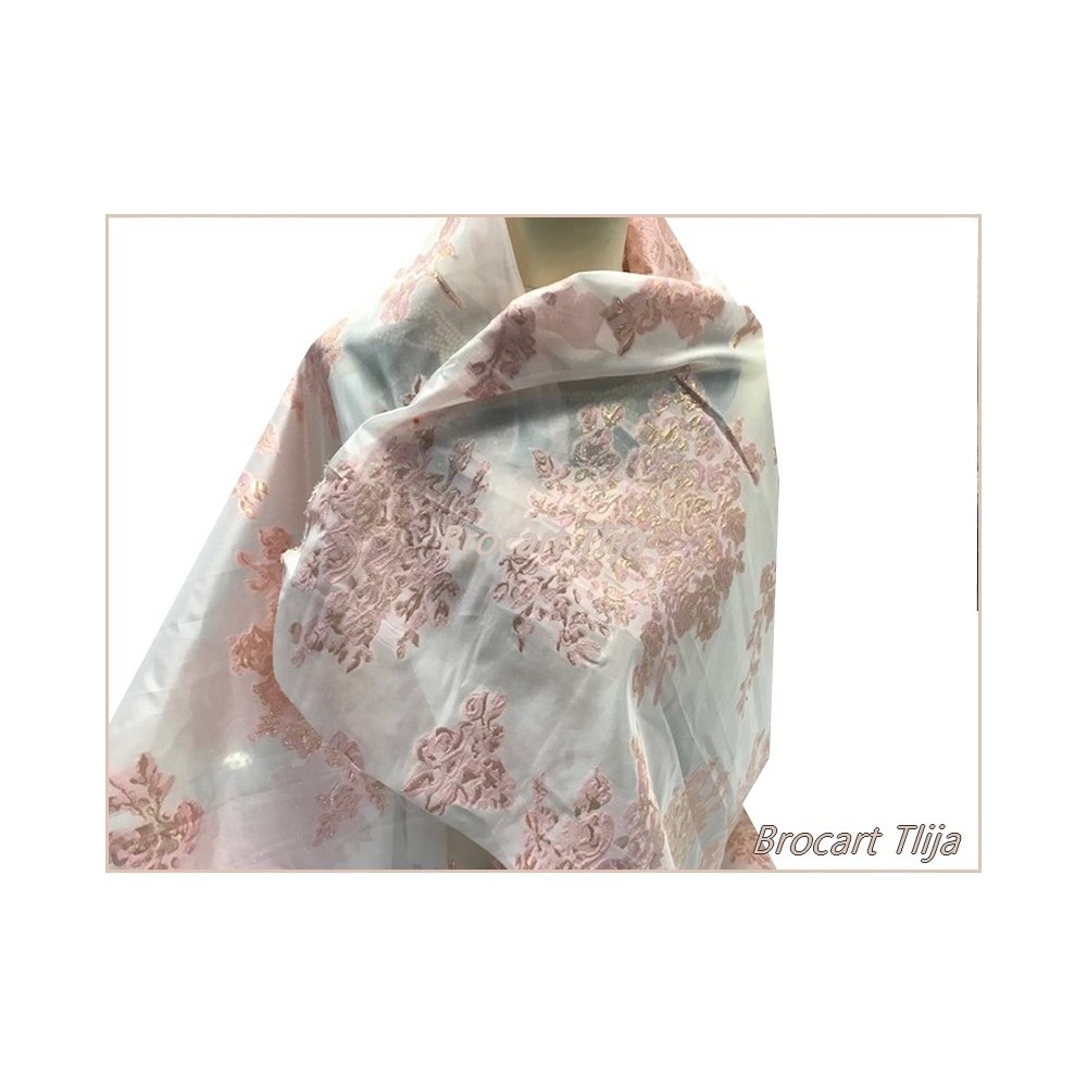 coupon de 3 mètres de Tissu brocart tlija au mètre de haut gamme, imprimé de motifs fleurs doré or sur un fond en organza rose avec un beau touché de soie.
