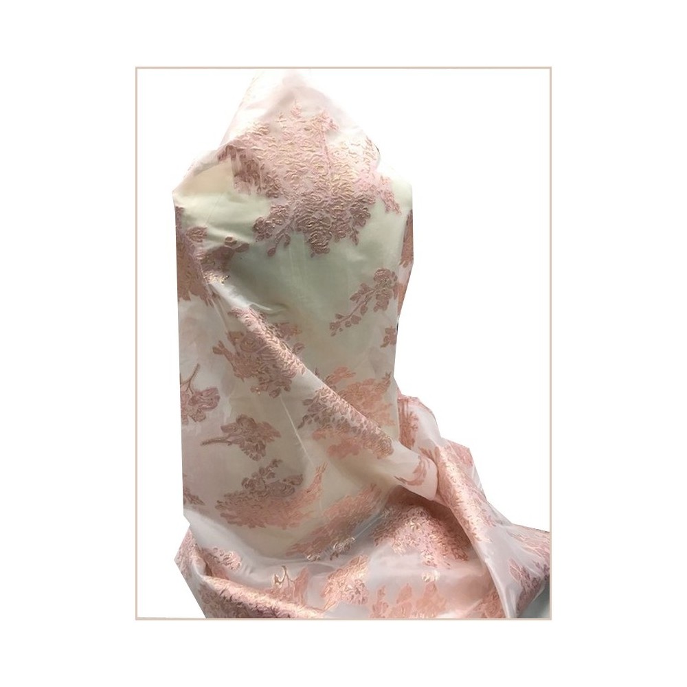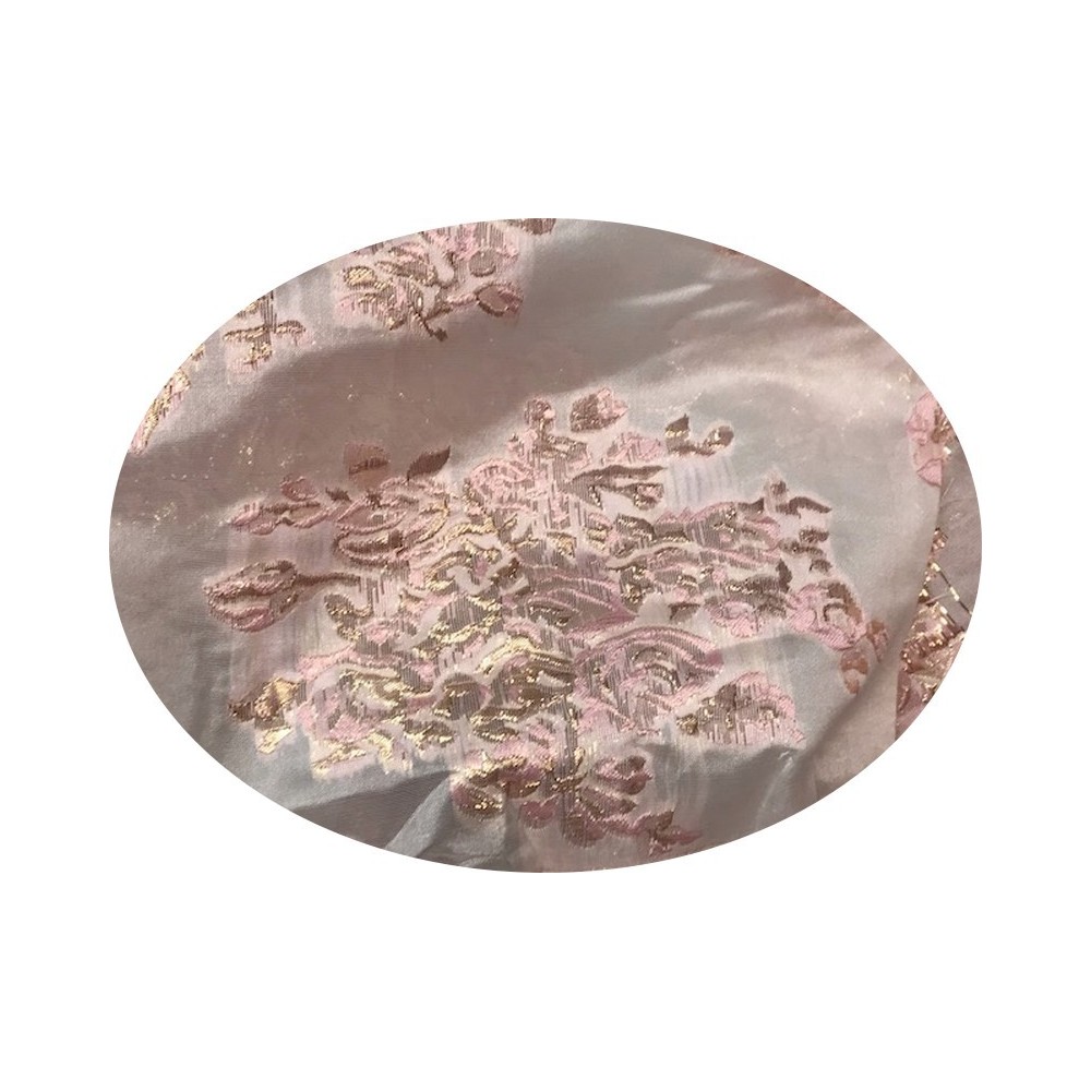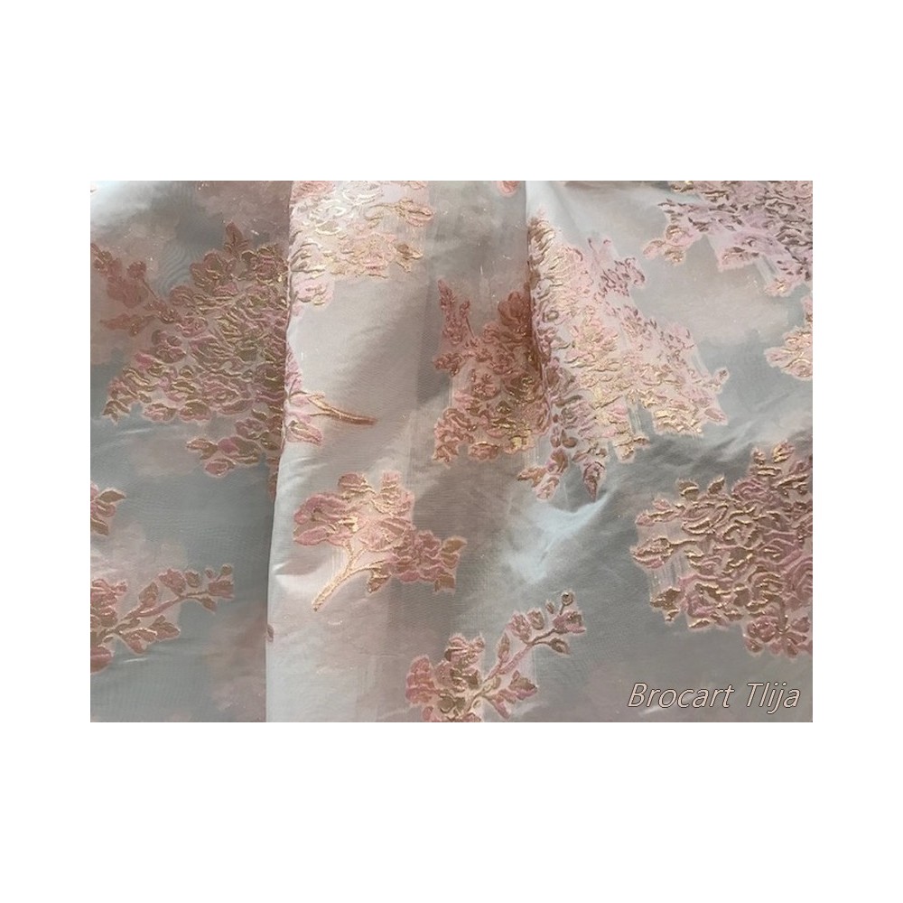 Tissu brocart tlija au mètre de haut gamme, imprimé de motifs fleurs doré or sur un fond en organza rose avec un beau touché de soie.
