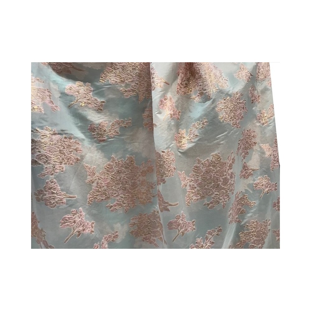 Tissu brocart au mètre de haut gamme, imprimé de motifs fleurs bleu ciel et doré or sur un fond ciel, avec un beau touché de soie.