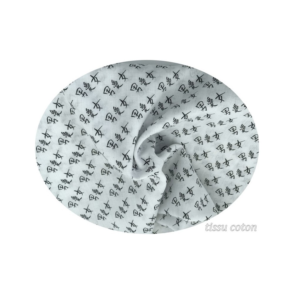 Tissu coton Léger au mètre imprimé en lettre chinoise sur fond blanc pour fabrication de vetements