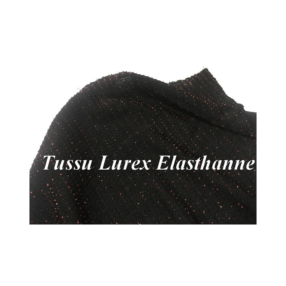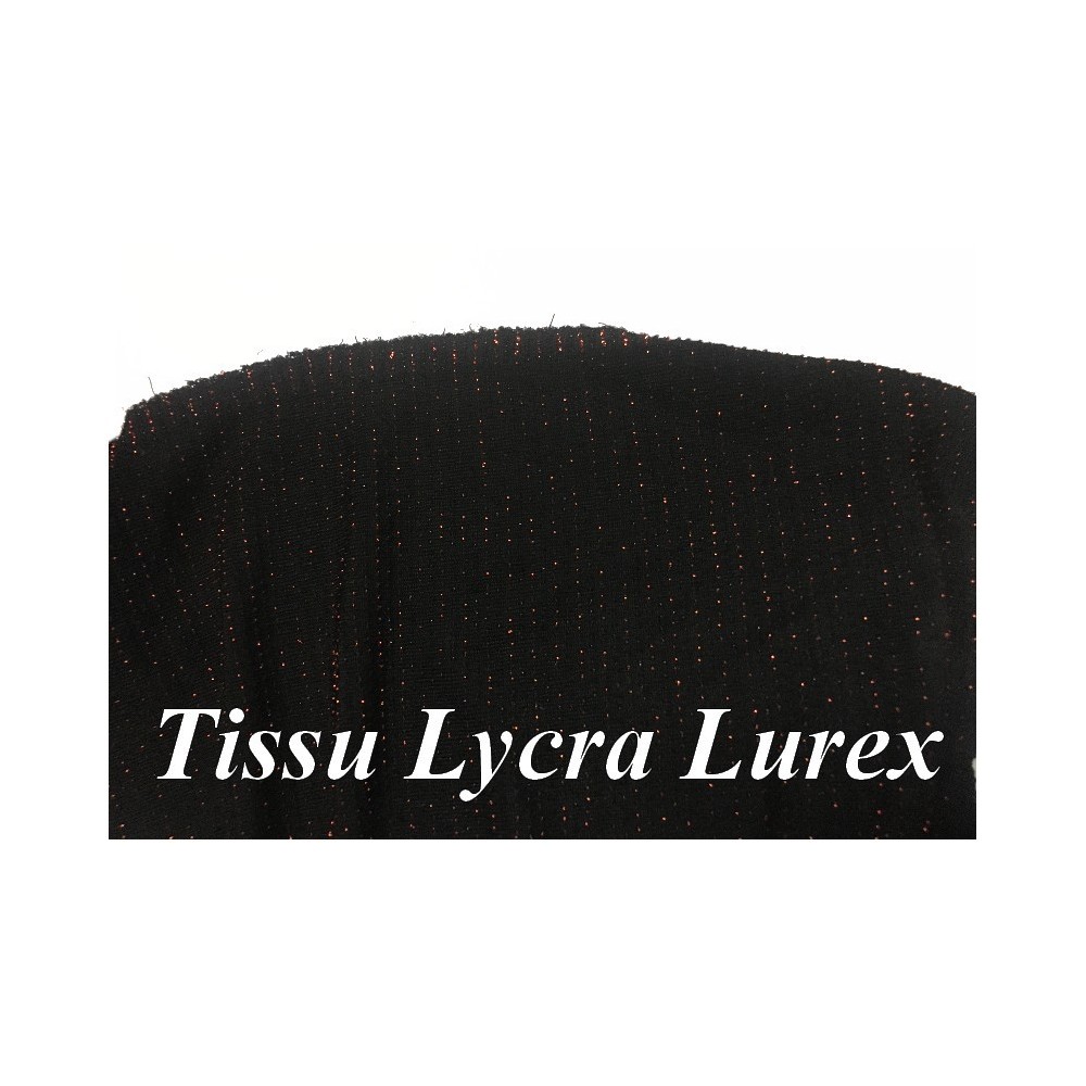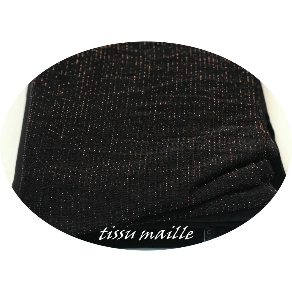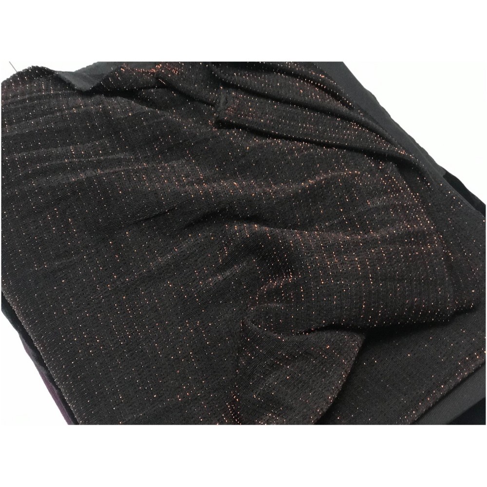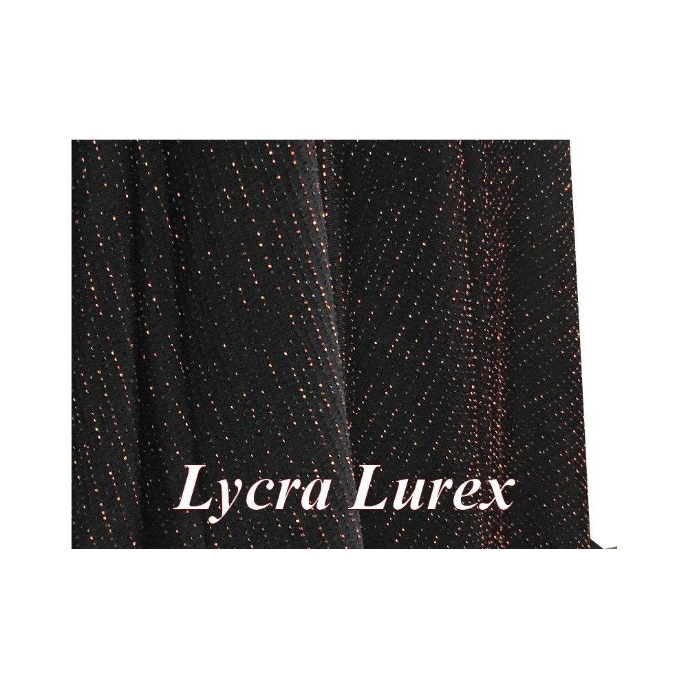 Tissu lycra maille extensible en lurex avec des rayures fine en couleur cuivre bronze sur fond noir.