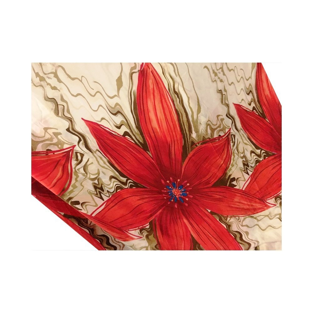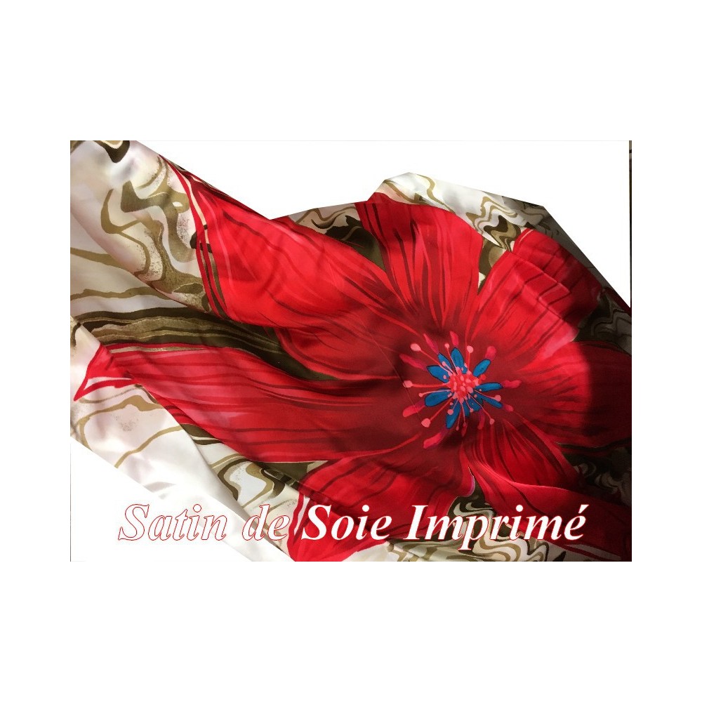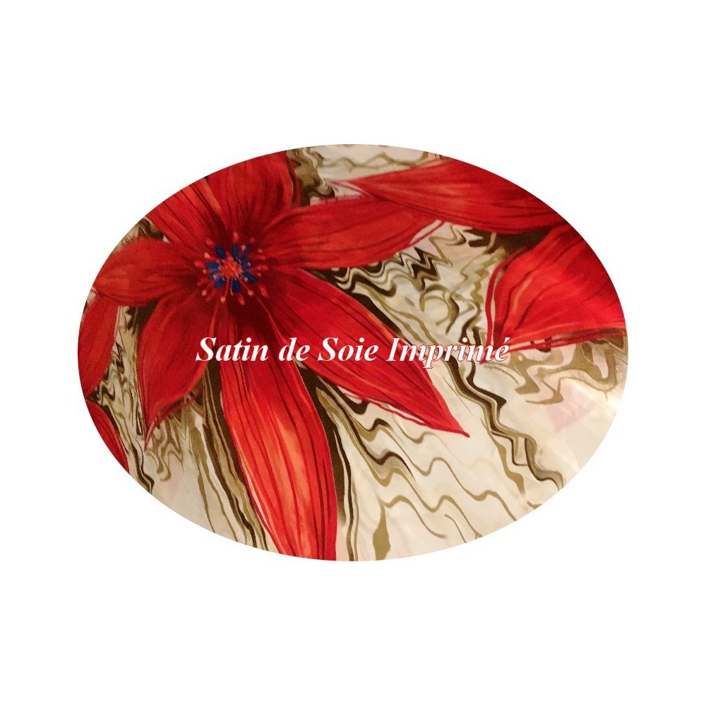 Tissu satin de soie au mètre imprimé en motifs fleurs de couleurs rouge sur fond crème