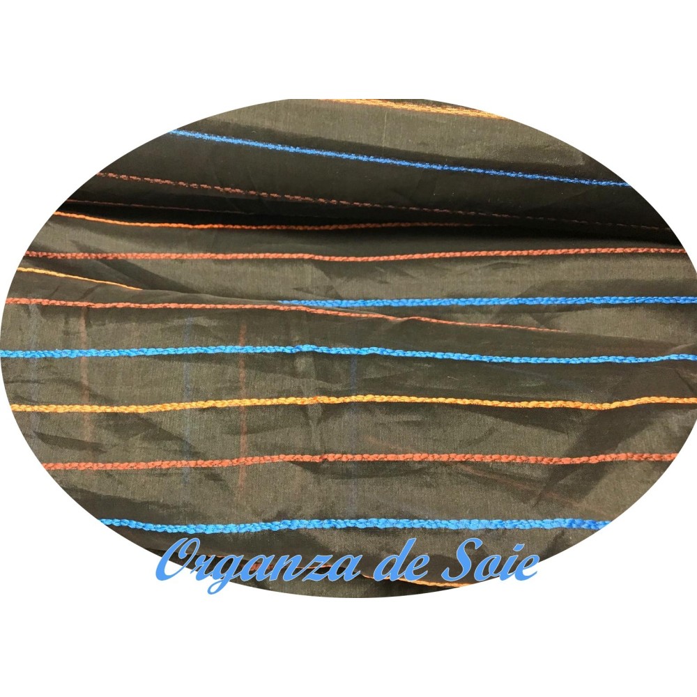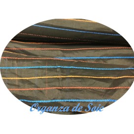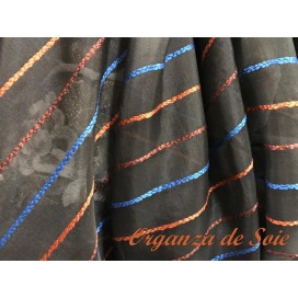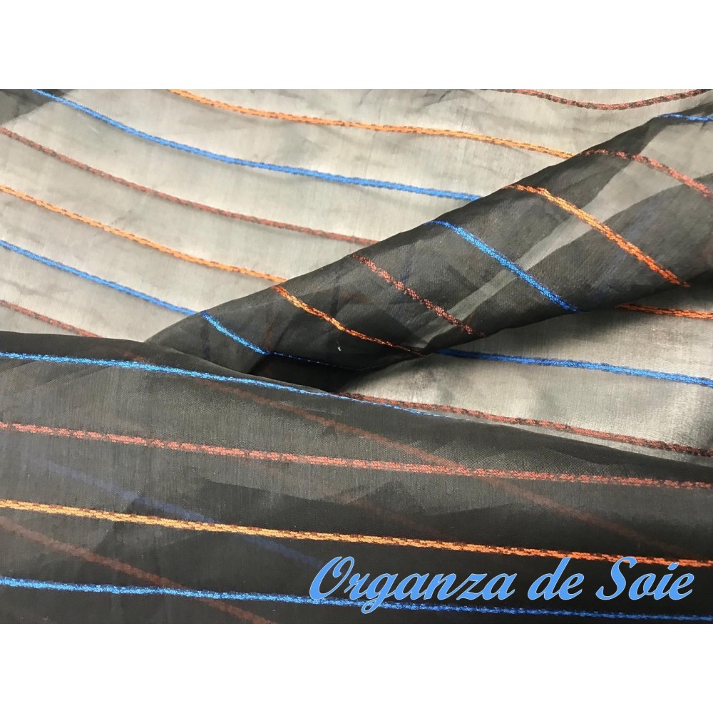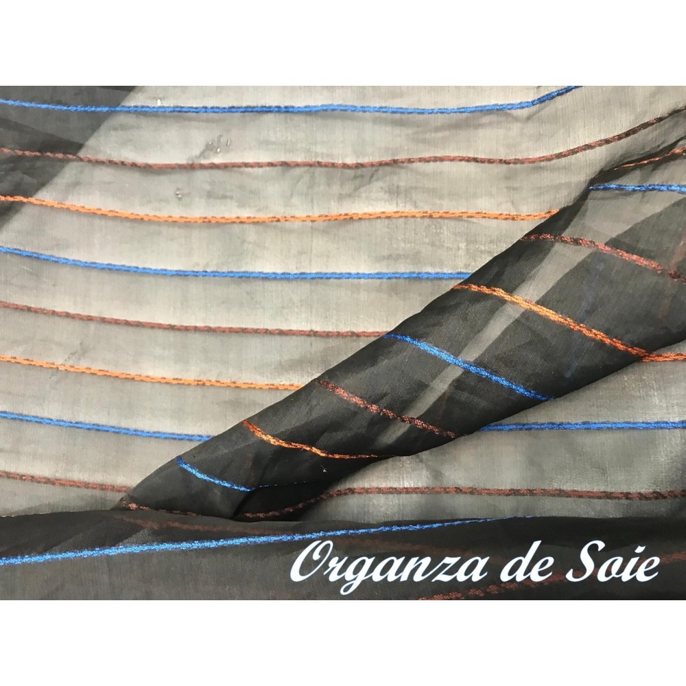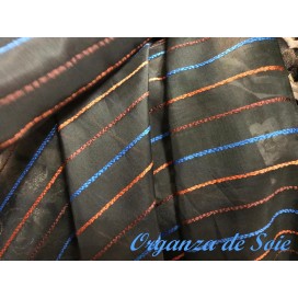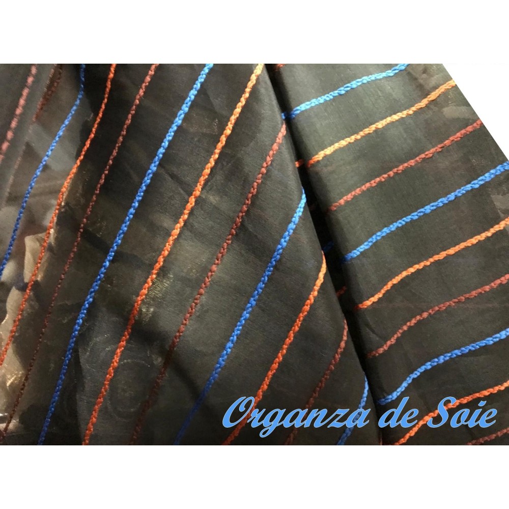 Découvrez notre sublime tissu organza de soie noir sublimées par des fines rayures brodé élégantes en orange, bleu indigo et brique, qui apporteront une touche de glamour à votre tenue.
