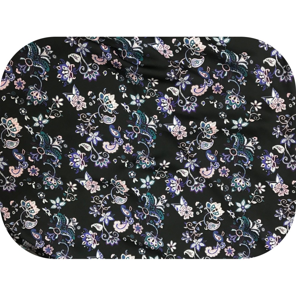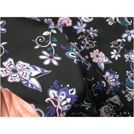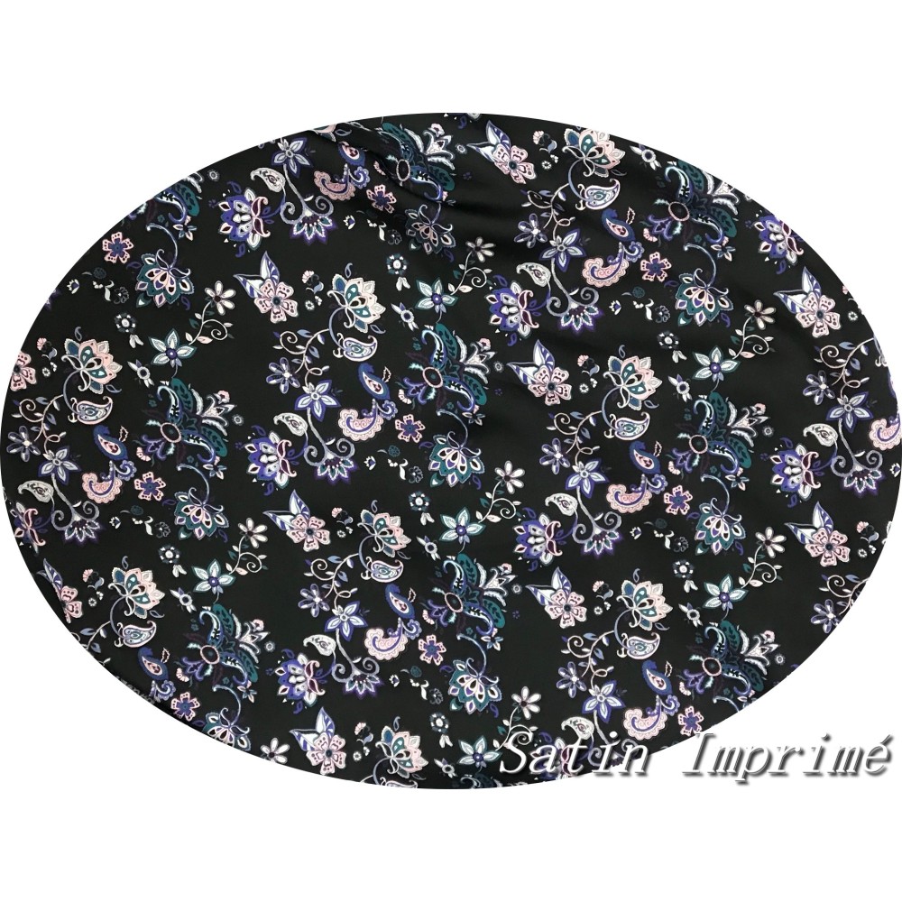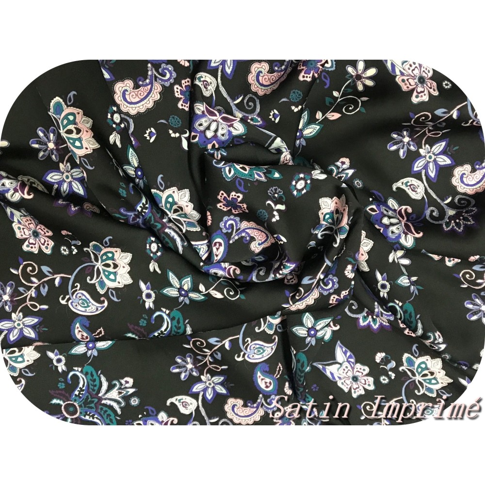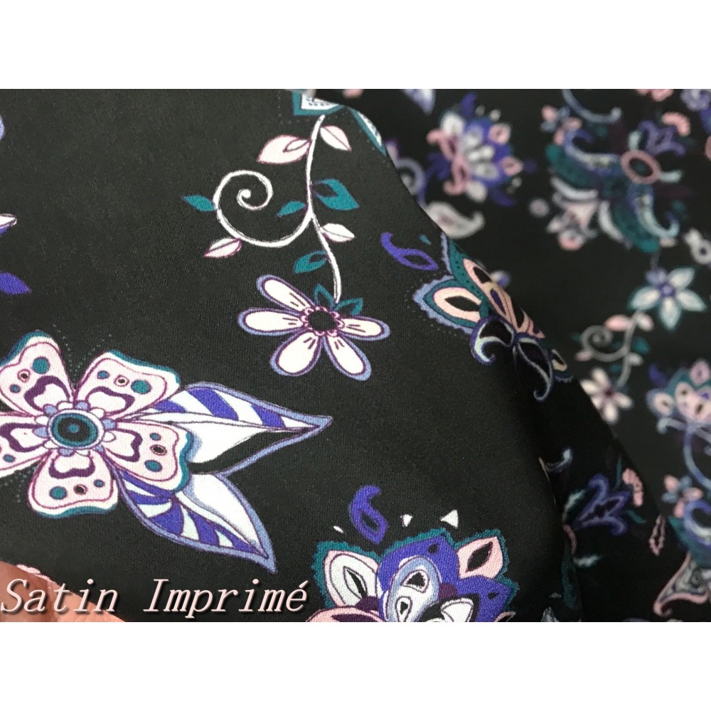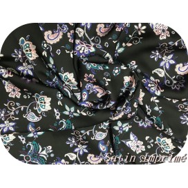 Découvrez notre somptueux tissu satin imprimé, orné de magnifiques fleurs roses et violettes sur un fond noir. Ce tissu incarne l'élégance et la féminité, avec ses motifs floraux vibrants et sa base noire raffinée.
