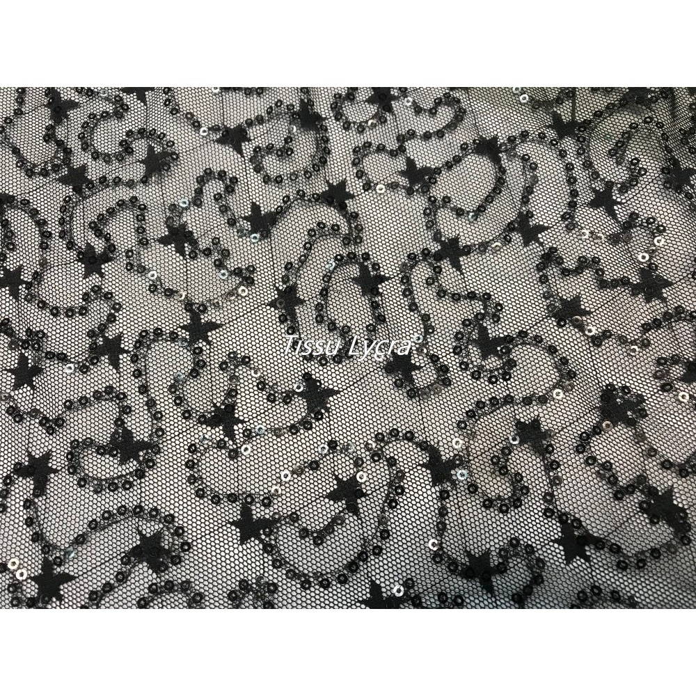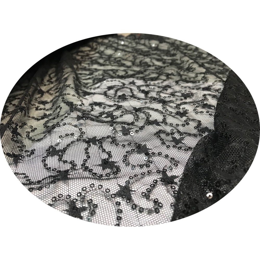 Tissu sequins en dentelle guipure et paillette sequins motif gouvernail en noir blanc.