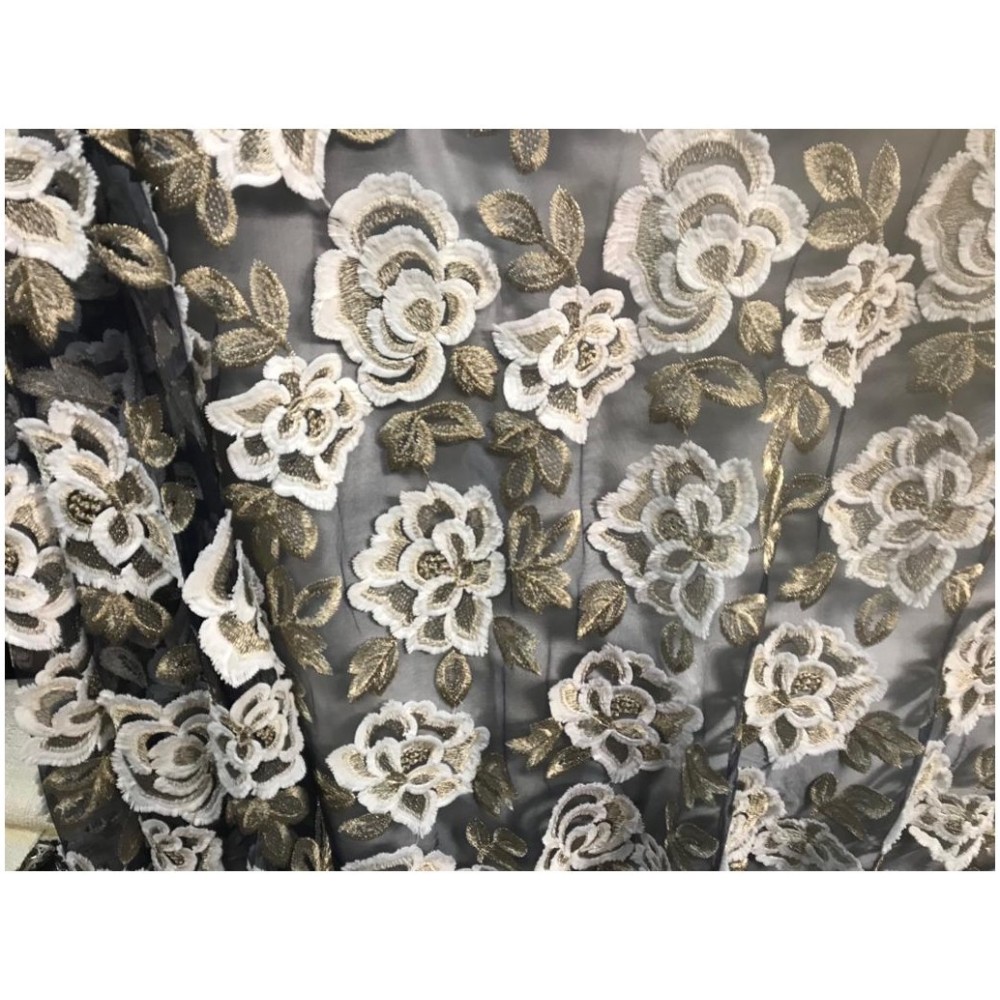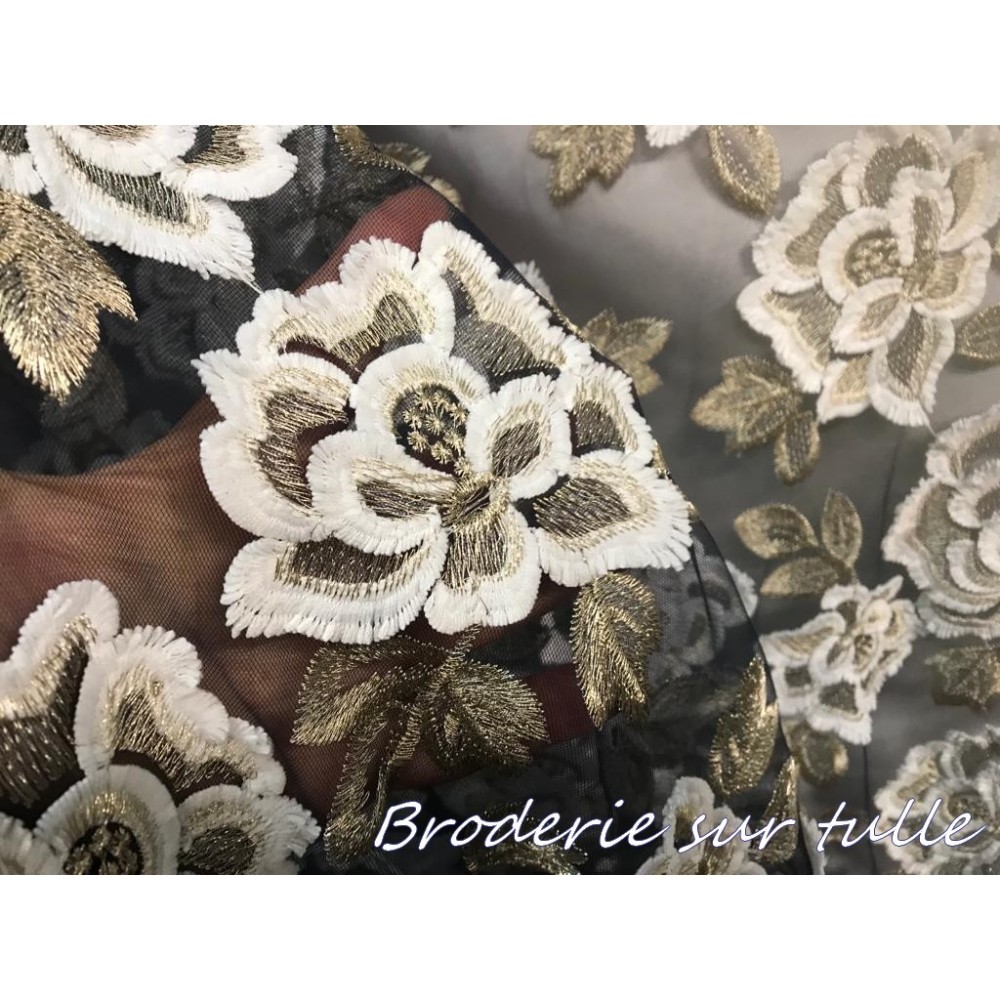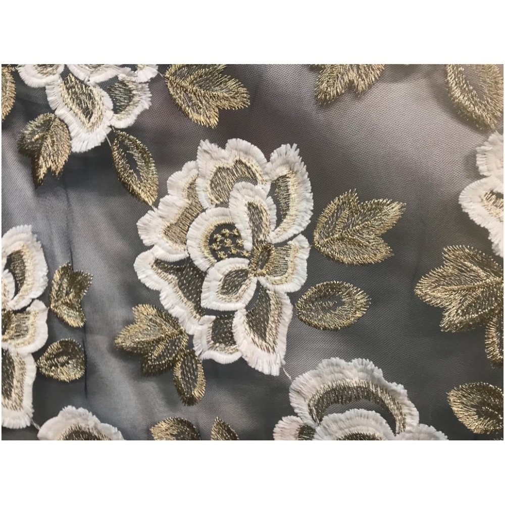 Dentelle Tissu brodé en motifs fleurs de couleur blanches et doré or, sur un support en tulle bleu marine