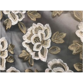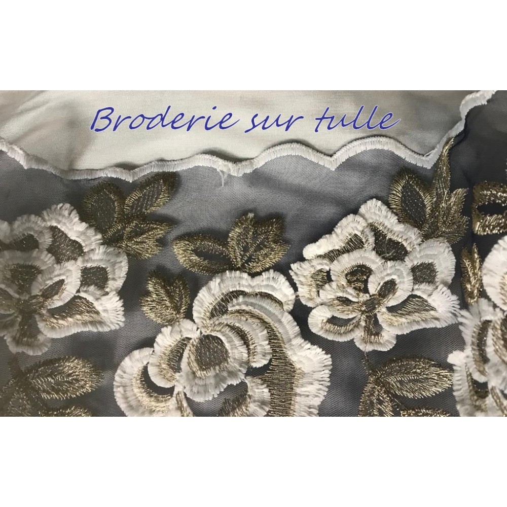 Voilage en tulle brodé festonné des deux cotées en fil doré or.