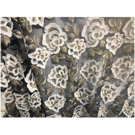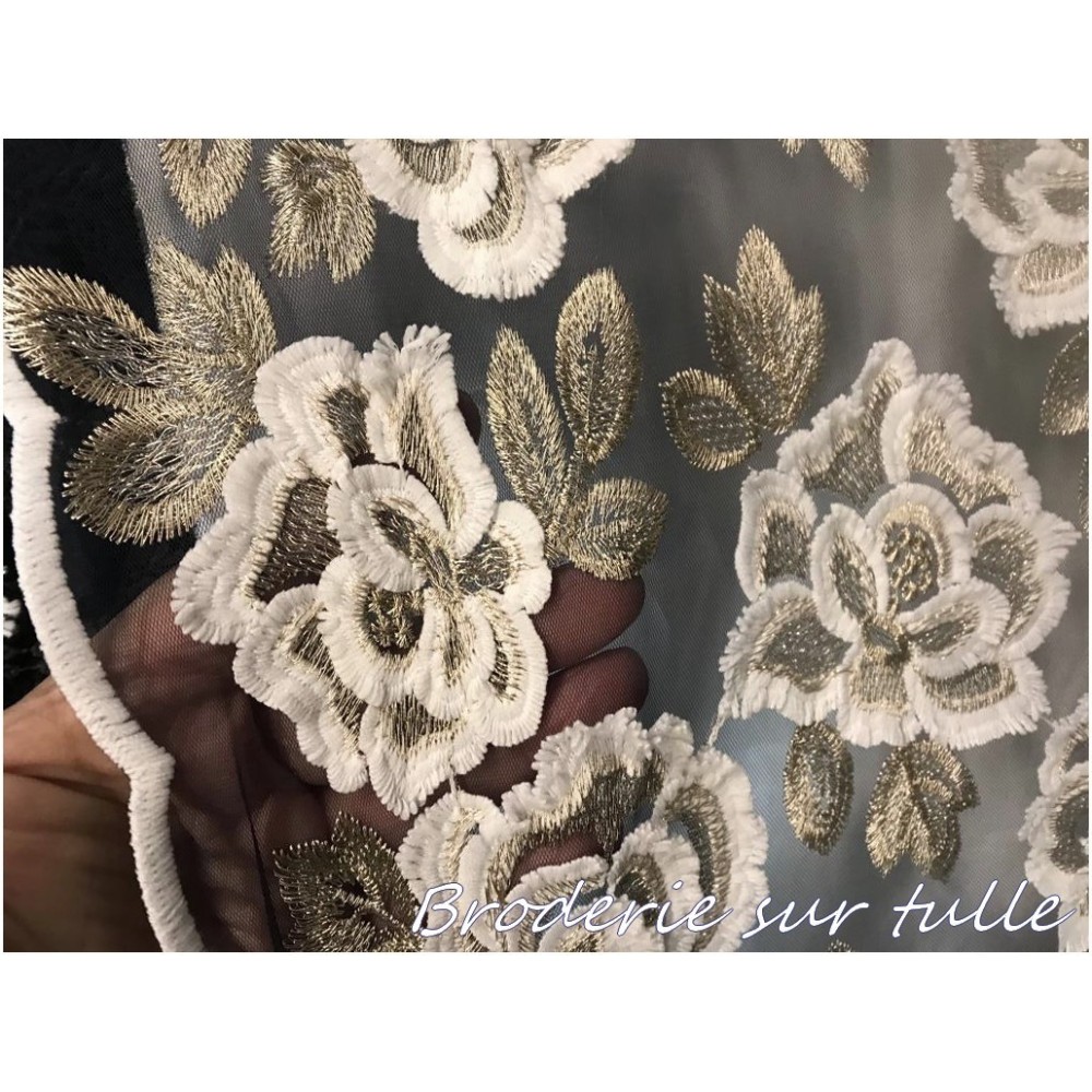 Dentelle caftan brodé au mètre en fleurs blanche sur tulle noir.
