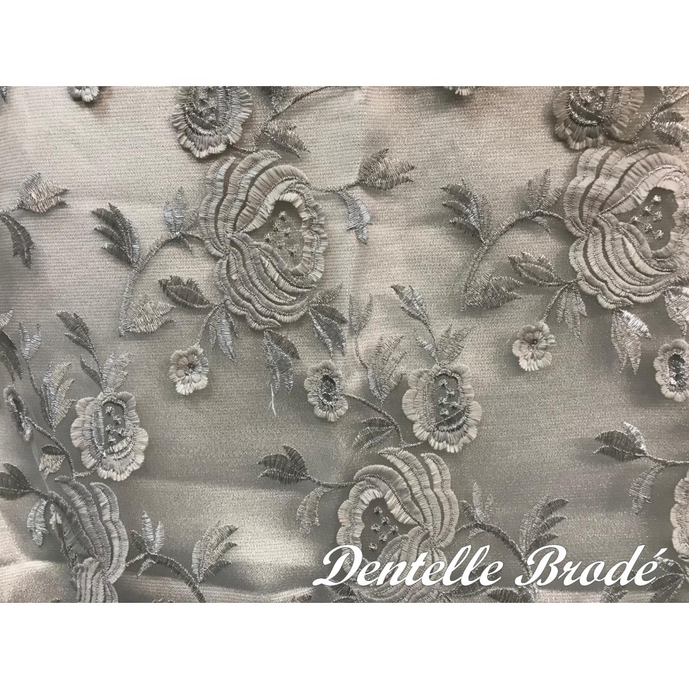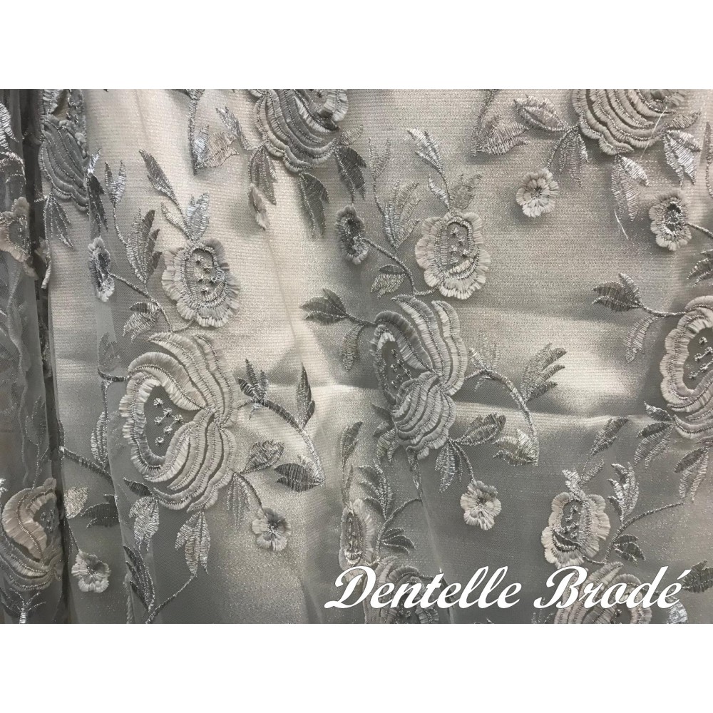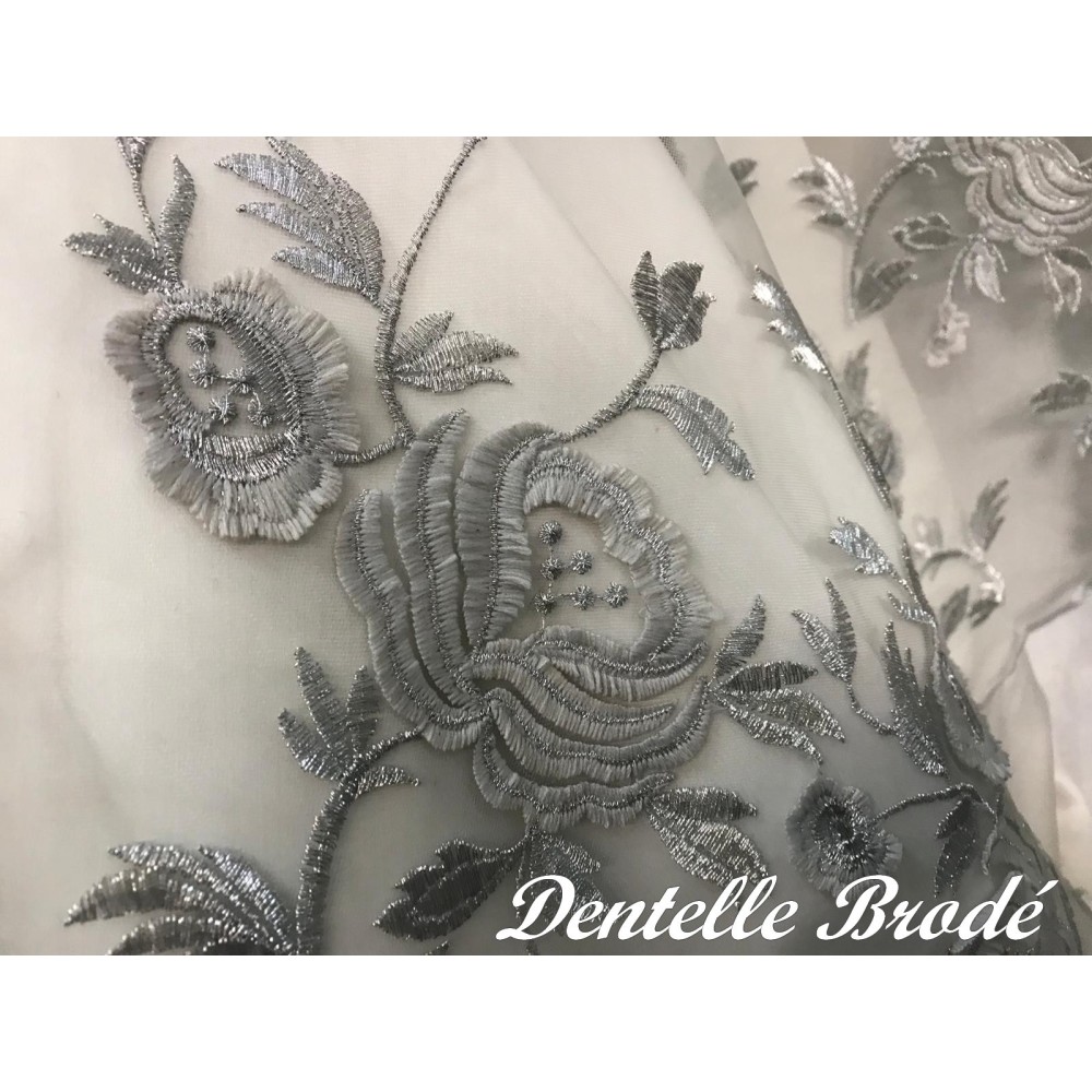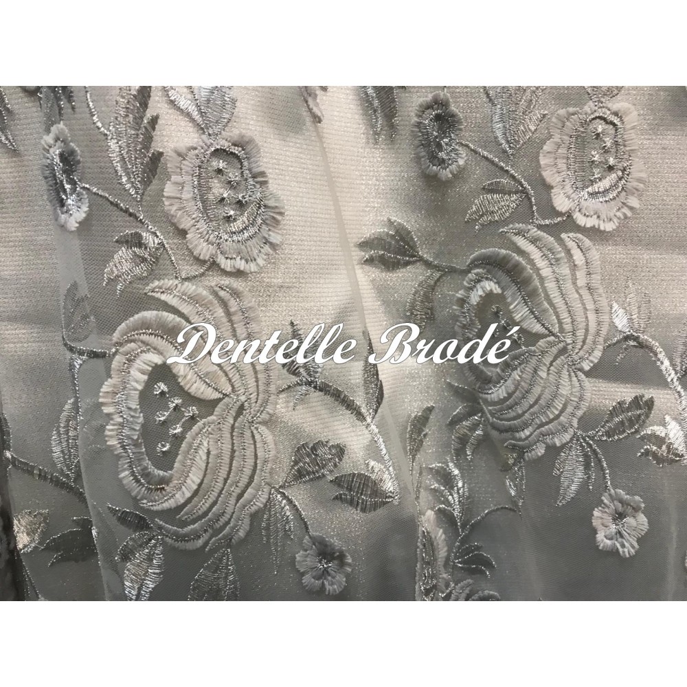 Ce tissu en dentelle argentée, orné de motifs floraux délicats, sur un support en tulle argenté, est une véritable merveille. Son voilage festonné des deux côtés ajoute une touche d'élégance à tout projet de couture. Avec une largeur d'1 mètre 25, il est vendu au mètre, offrant ainsi une flexibilité totale pour vos créations.
