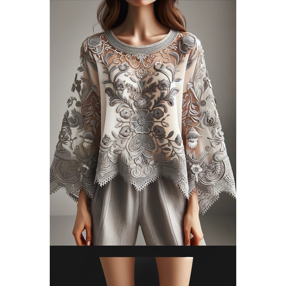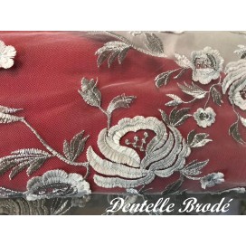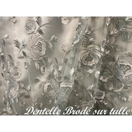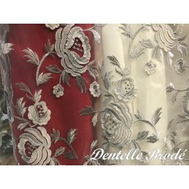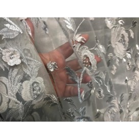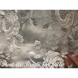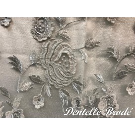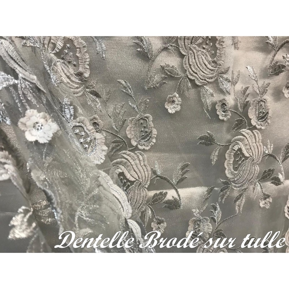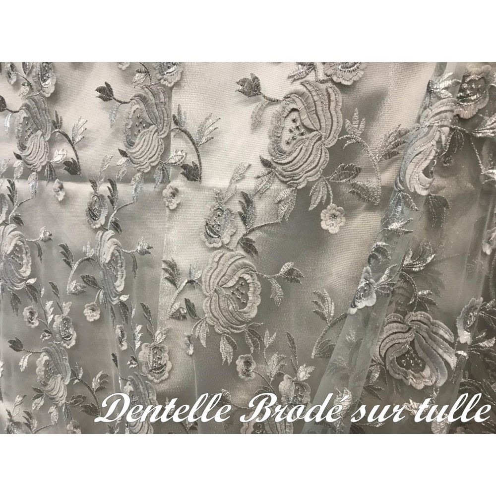 Ce tissu en dentelle argentée, orné de motifs floraux délicats, sur un support en tulle argenté, est une véritable merveille. Son voilage festonné des deux côtés ajoute une touche d'élégance à tout projet de couture. Avec une largeur d'1 mètre 25, il est vendu au mètre, offrant ainsi une flexibilité totale pour vos créations.