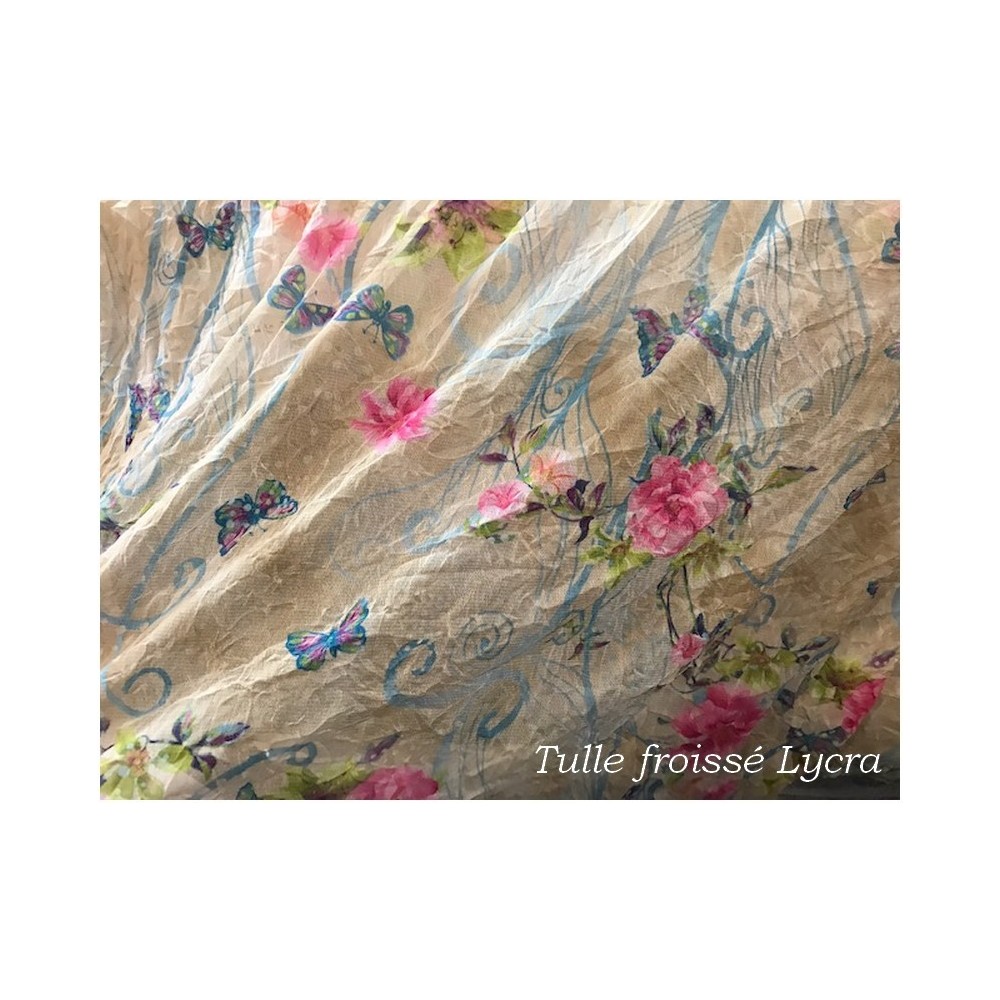 Tissu tulle froissé imprimé fleurs en résille élastique au mètre pas cher..