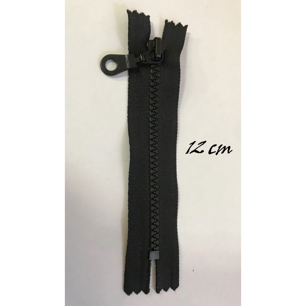 Zip fermeture en 12 cm à coudre en maille injectée plastique couleur Noir avec un curseur métal en forme