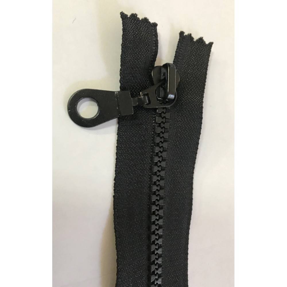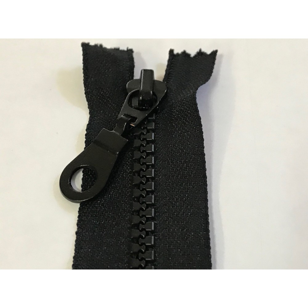 Zip fermeture à coudre en grande longueur, en maille injectée plastique couleur noir avec un curseur de forme poire.