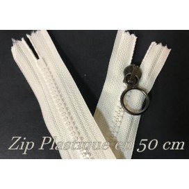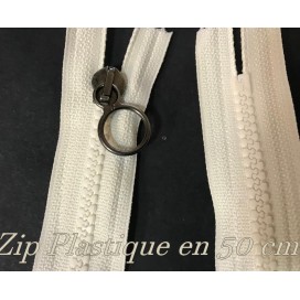 Zip fermeture à coudre en grande longueur, en maille injectée plastique couleur écru avec un curseur en metal en forme de rondelle