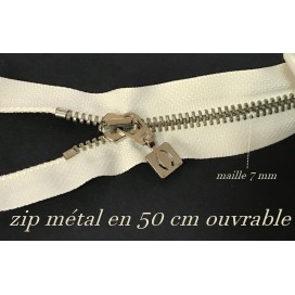 "Découvrez notre fermeture à glissière en métal avec une maille argentée de 7 mm de largeur, parfaite pour vos projets de couture, confection, et blousons en cuir. Cette fermeture éclair métallique séparable de grande largeur mesure 50 cm de longueur et est ouvrable pour une utilisation pratique. Le double curseur en métal argenté et la tirette assortie ajoutent une touche d'élégance à votre création. Nos fermetures à glissière en métal sont vendues à l'unité, et nous proposons des prix dégressifs pour vous offrir le meilleur rapport qualité-prix. Commandez la vôtre dès aujourd'hui pour sublimer vos créations couture."